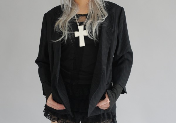 「ボク自身が中高生の頃に憧れて読んでいたCHOKiCHOKiの古着ファッションに、自分なりのエッセンスを加えて作りました。ヘアのポイントは、ラインを残しつつも風に柔らかくなびいてくれるデザインレイヤーです」。ファッションについては「パジャマシャツとモヘアカーディガンでグランジ感を出しながら、全体を淡いペールトーンにまとめて女性らしさを表現しました」。女性らしい柔らかい曲線美があるくびれウルフに、ボーイズライクなファッションというミックス感も新鮮!!