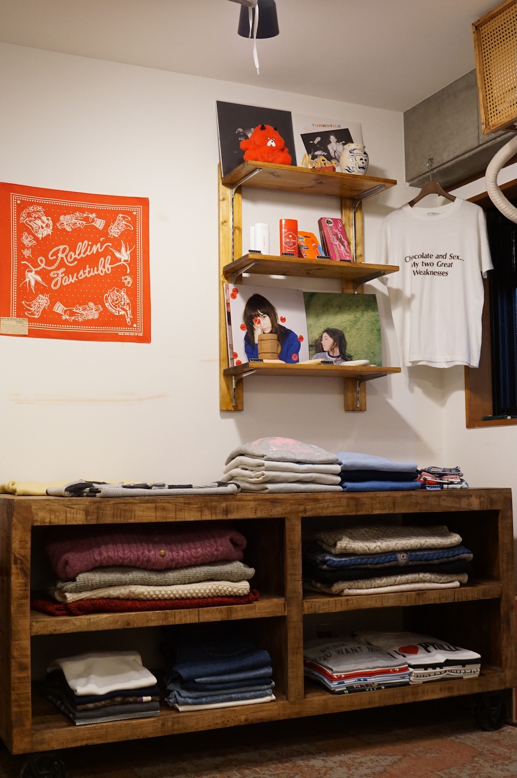 三軒茶屋は探索しがいがある街ではあるけど、その中においても「え、こんなところに古着屋があるの?」って探しがいがいがあるところ(いい意味で)。レディース古着が感じよく並んでいる目線の隅に、レコードジャケットがあって、趣味がうかがえる。フィッテイングルームがだだっぴろい!