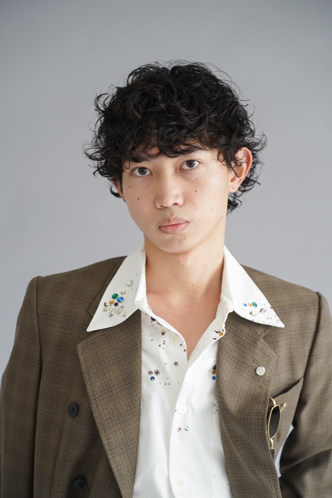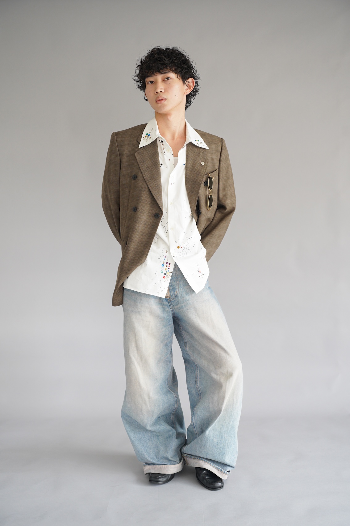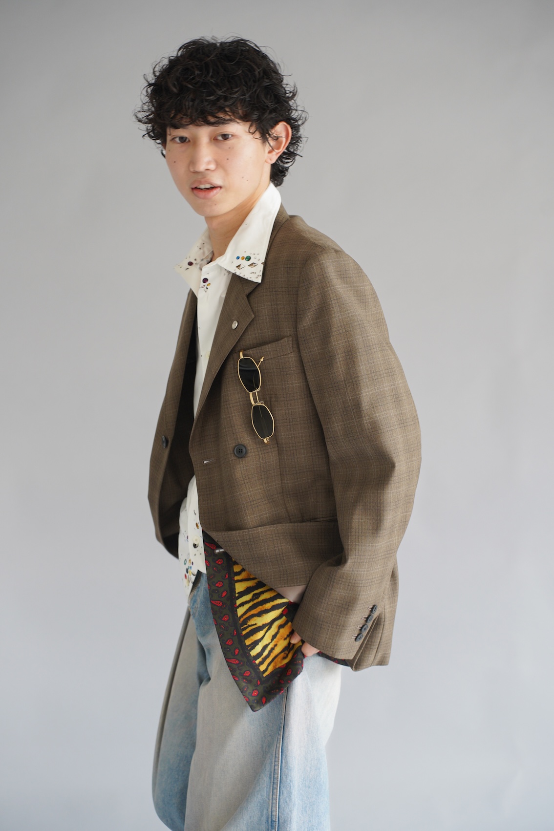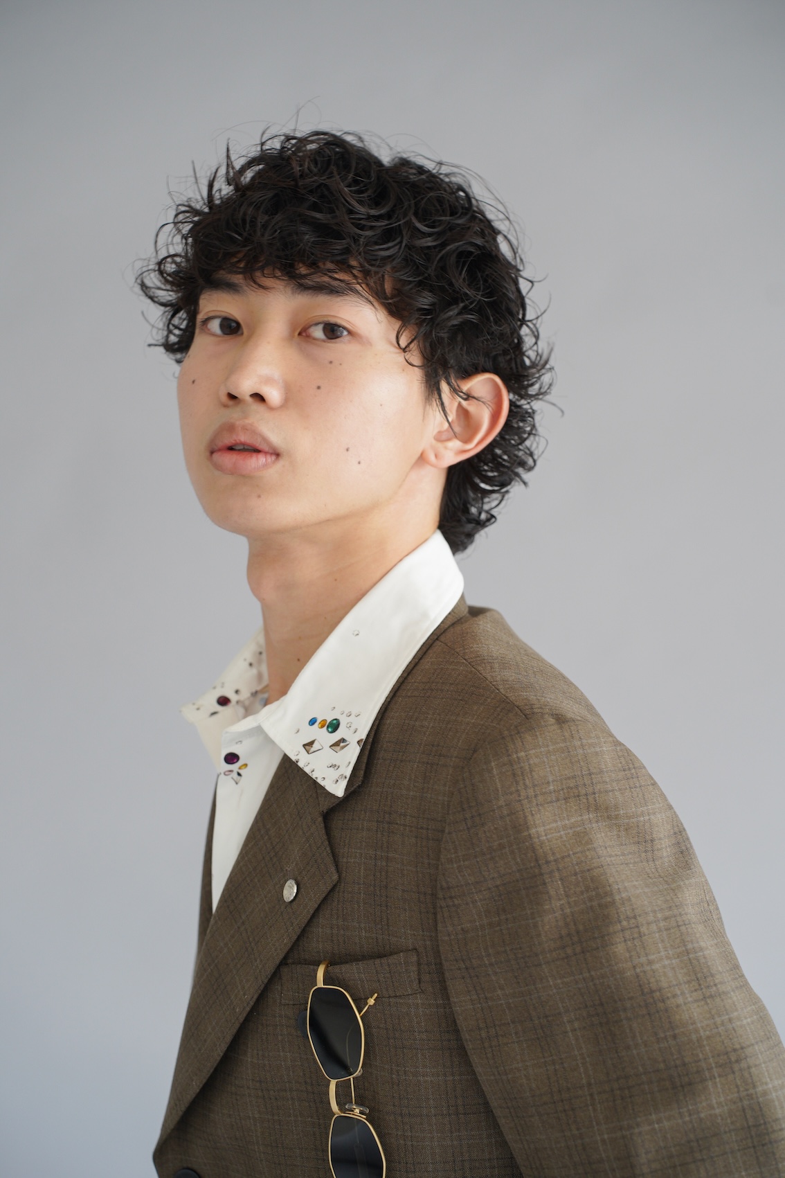 「海外スタイルを街中で見ると目を引くから」美容師さんならではのプロっぽい視点をもって過ごす中で発想されたのが、この「外国人のくせ毛みたいなカーリーパーマ。くせ毛風なので、ただのクルクルじゃなくて、抜け感も作りながらの強めパーマをかけました」。メンズヘアのバリエーションを感じるスタイル。ファッションは「強めのパーマなので、可愛くなりすぎないように、テーラードジャケットで引き締めて、遊び心あるシャツで色気を出しました」という言葉通り、シャツの柄をチラ見せするのがポイント。