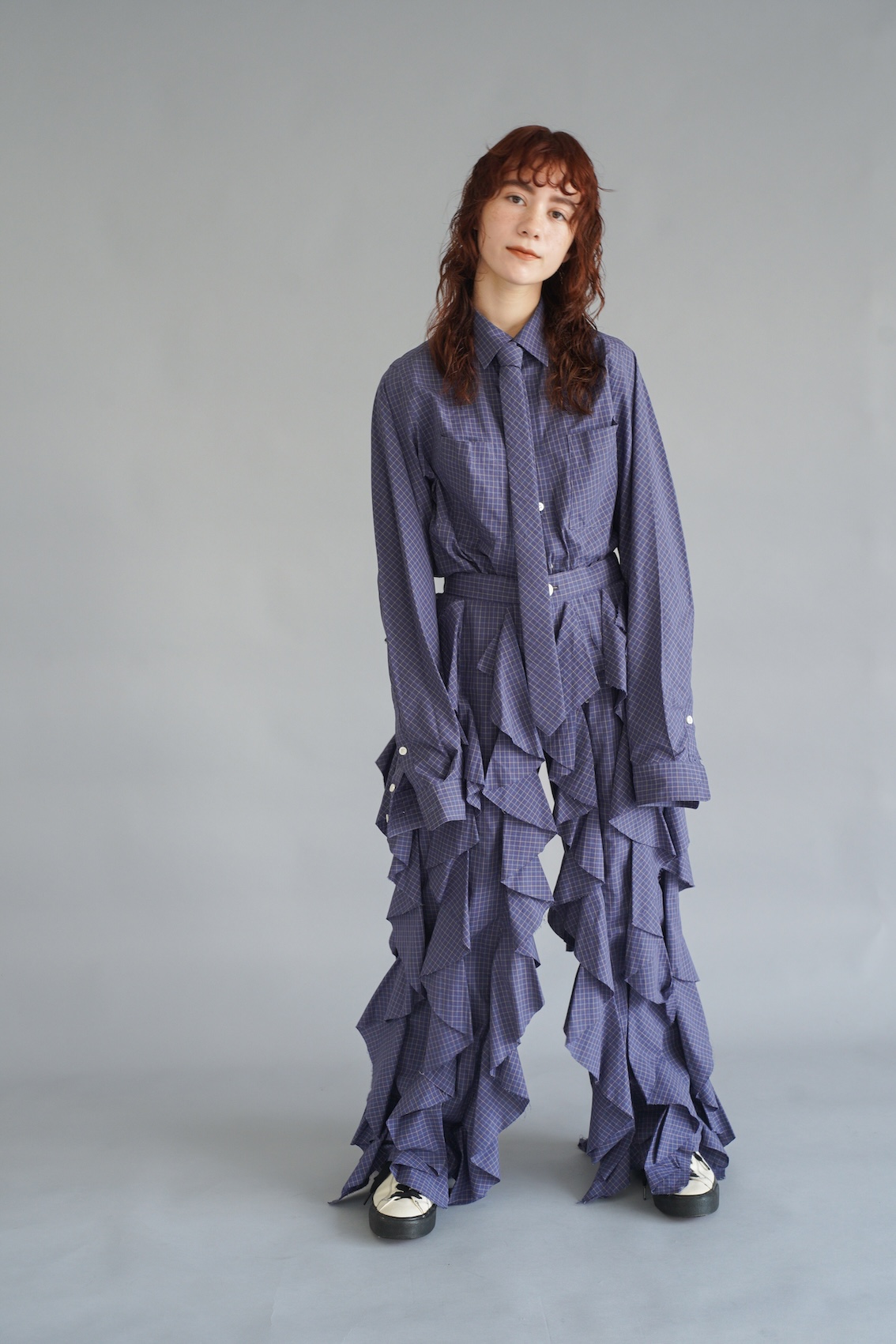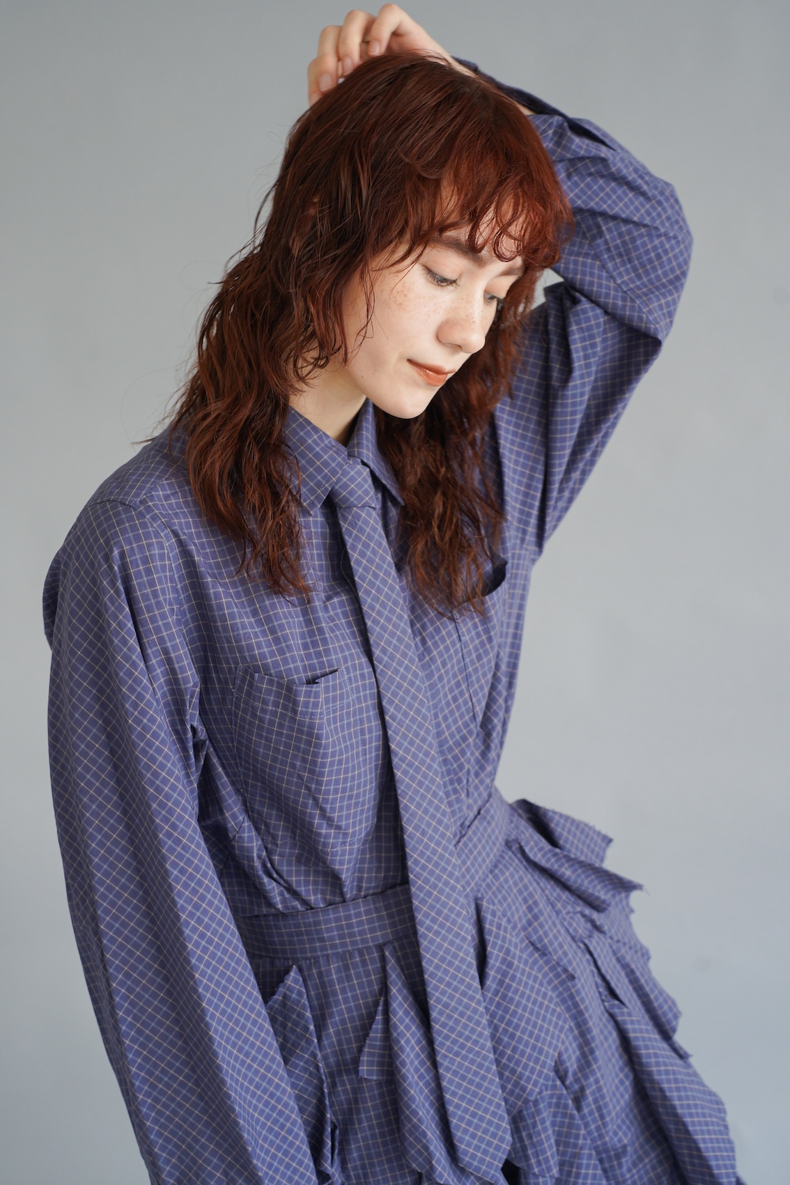 「季節感を考え、レトロ感のあるヘアスタイルが可愛いと思ったので、そんな雰囲気が似合いそうなスタイルにしました!」。スカーレットオレンジのカラーとウエーブの動きが、秋冬の空気を感じさせるスタイル。「短く切り込んだ前髪とフロントにボリュームの出るレイヤーカットがポイントです!」。ラッフルデザインのボトム、ロングスリーブというモード感のあるファッションにも注目。「ヘアスタイルのマレット感とモデルさんの顔立ちでレトロな雰囲気がでているので、衣装をプレッピー×モードなスタイルにして、バランスをとりました!」