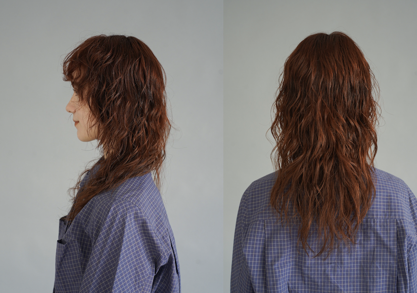 全体のベースを胸上レングスで前上がりにカットし、前髪は目の上に設定。サイドもバックと顔まわりのレイヤーに合うようにレイヤーを入れる。カラーは海外の女の子のような赤毛をイメージしたスカーレットオレンジ。パーマスタイルと合わせることで、「ウェットな質感だとモードっぽく、ドライでもラフな抜け感のでるおしゃれな雰囲気に仕上がってくれます!」