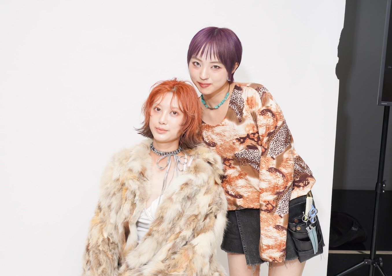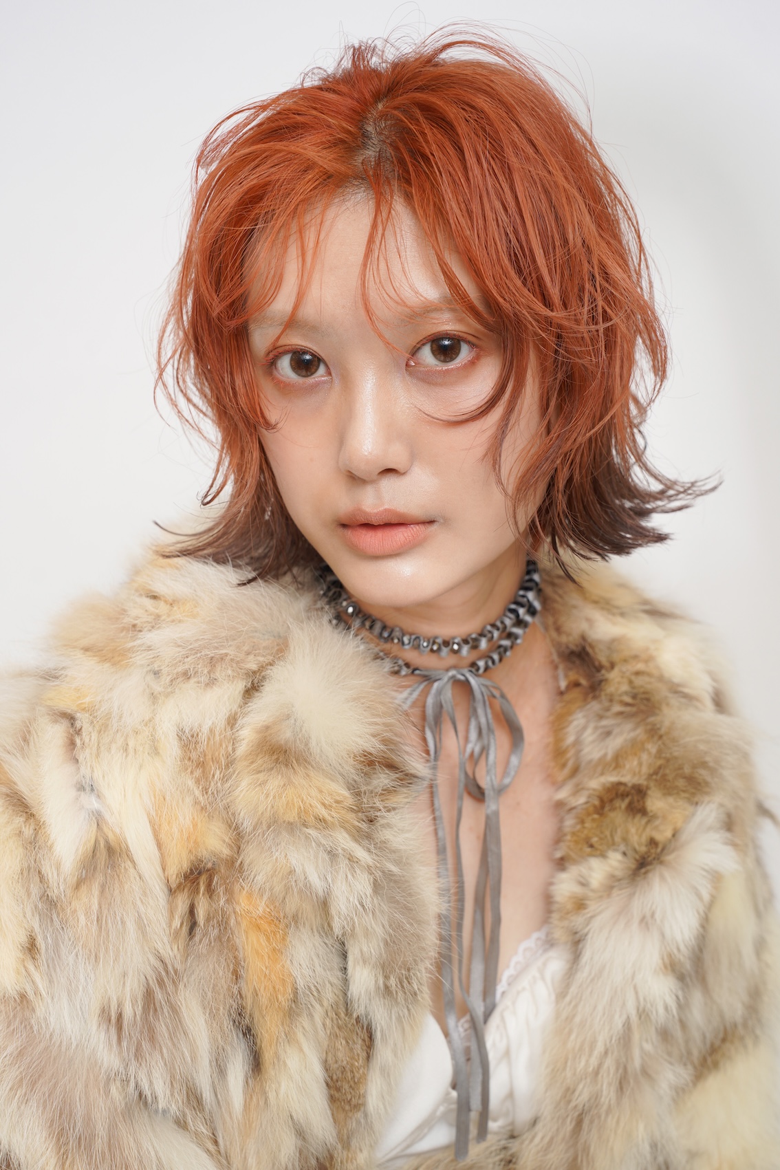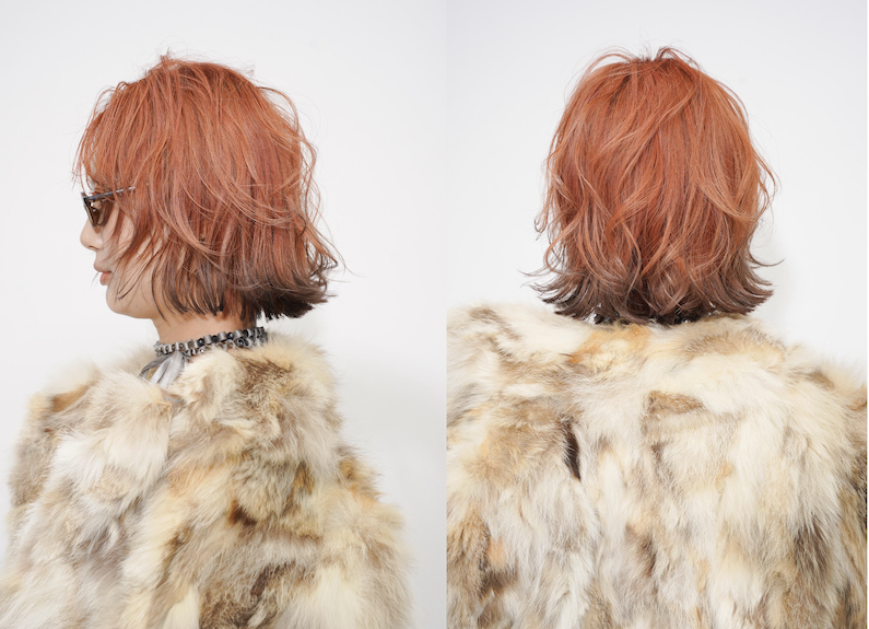 「多色使いやレイヤード、素材感mixが今のトレンドで、私もすごく好きなキーワードなので今季注目しています。ファッションがはっきりしてくるシーズンなのヘアはであまり主張しすぎず、程よいバランス感締まり感を意識しました」と、創ったのはフェミニンになりすぎないボブと秋ファッションのスタイル。「女性らしいアプローチをしたかったので、ヘアはミニマムであったかい血色感のあるオレンジに。タイツはヘアに対比するブルー。キャミソール とリンクさせて艶感のある素材を選びました。ファーコートは特に存在感があり強めに見えるので、首から肩にかけて詰まりすぎないようにアイテムのサイズ感は特にこだわっています」。ヘアについては「ファーコートに対してさらに甘いヘアにすると重い印象になるので、色味に少し渋さを入れたり巻きすぎたりしないニュアンシーさを大事にしてます」。ヘアとファッションのバランスは、やはり大事であることを再認識できる作品!