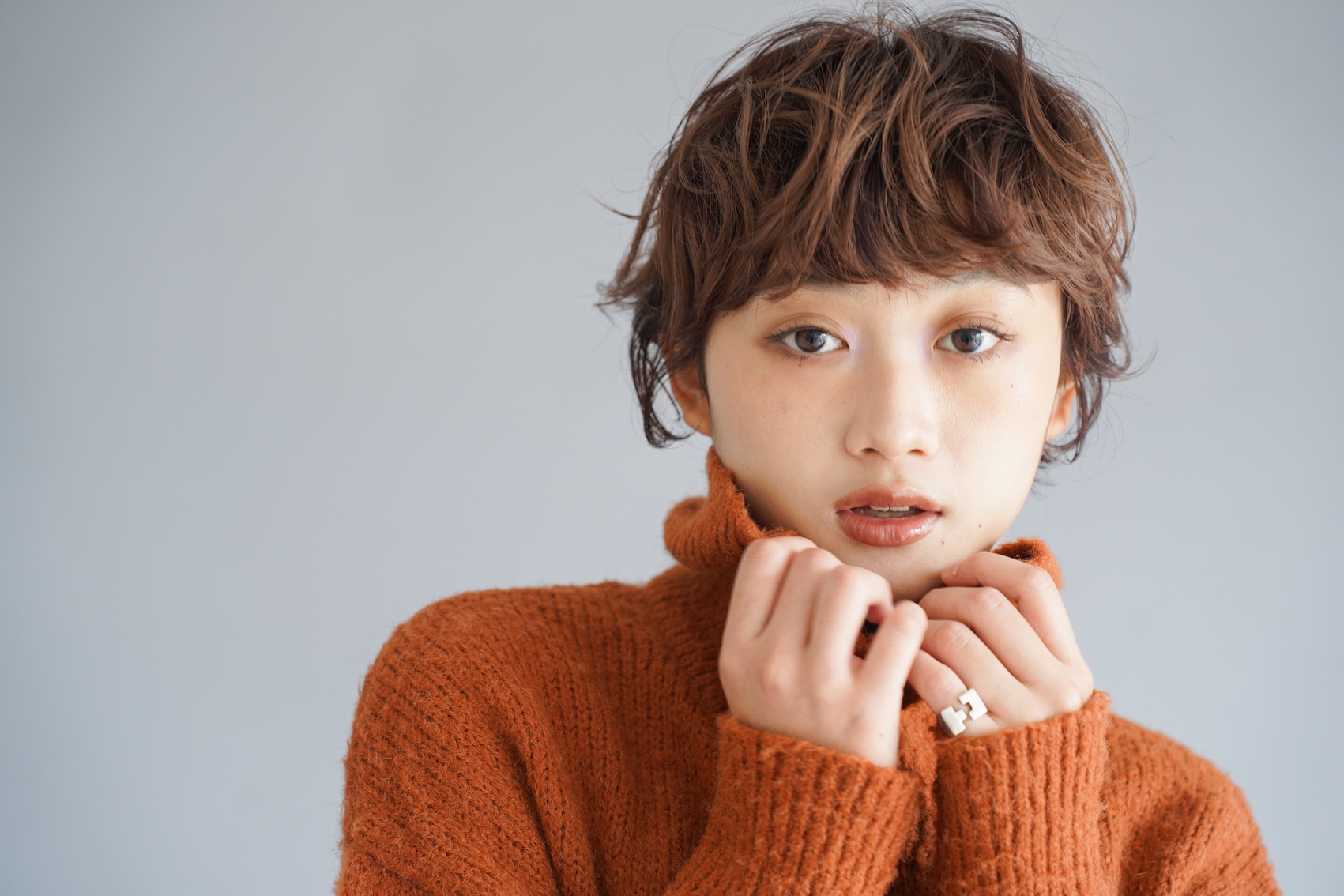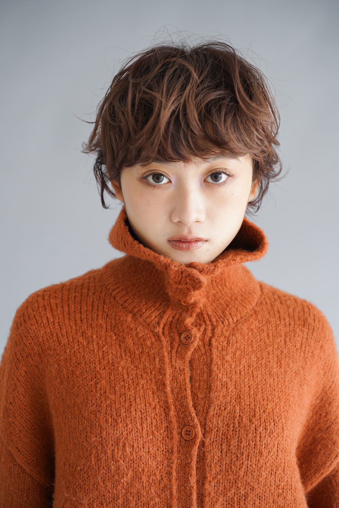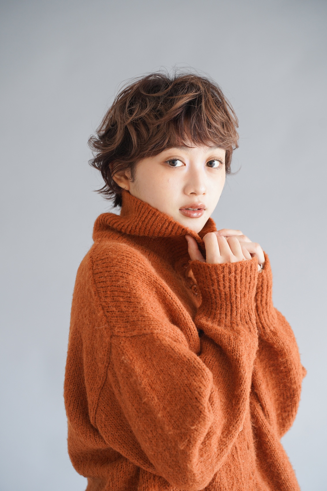 「ヘア、メイク、ファッションをトータルで見た時に、メンズっぽいバランスをキレイめにレディっぽく落とし込むのが好きです。マニッシュなショートヘアに、ショート丈やまつ毛にポイントを置いたメイクのバランスが、自分らしくあり、今年の秋に推していきたいスタイルです」というmiuさん。メディア初登場は、自分のやりたいことを反映したショートヘアを発表してくれた。ポイントは「ストレートだとナチュラルなスタイルになる髪型なので、ファッションとメイクとのバランスで、クセを活かしたパーマ風のスタイルを作りました。カラーで透け感を出すことで、重すぎないマニッシュなバランスにしています」。大きめトップスにマイクロ丈のパンツやスカートを合わせたファッションも、担当者の気分を映したもの。