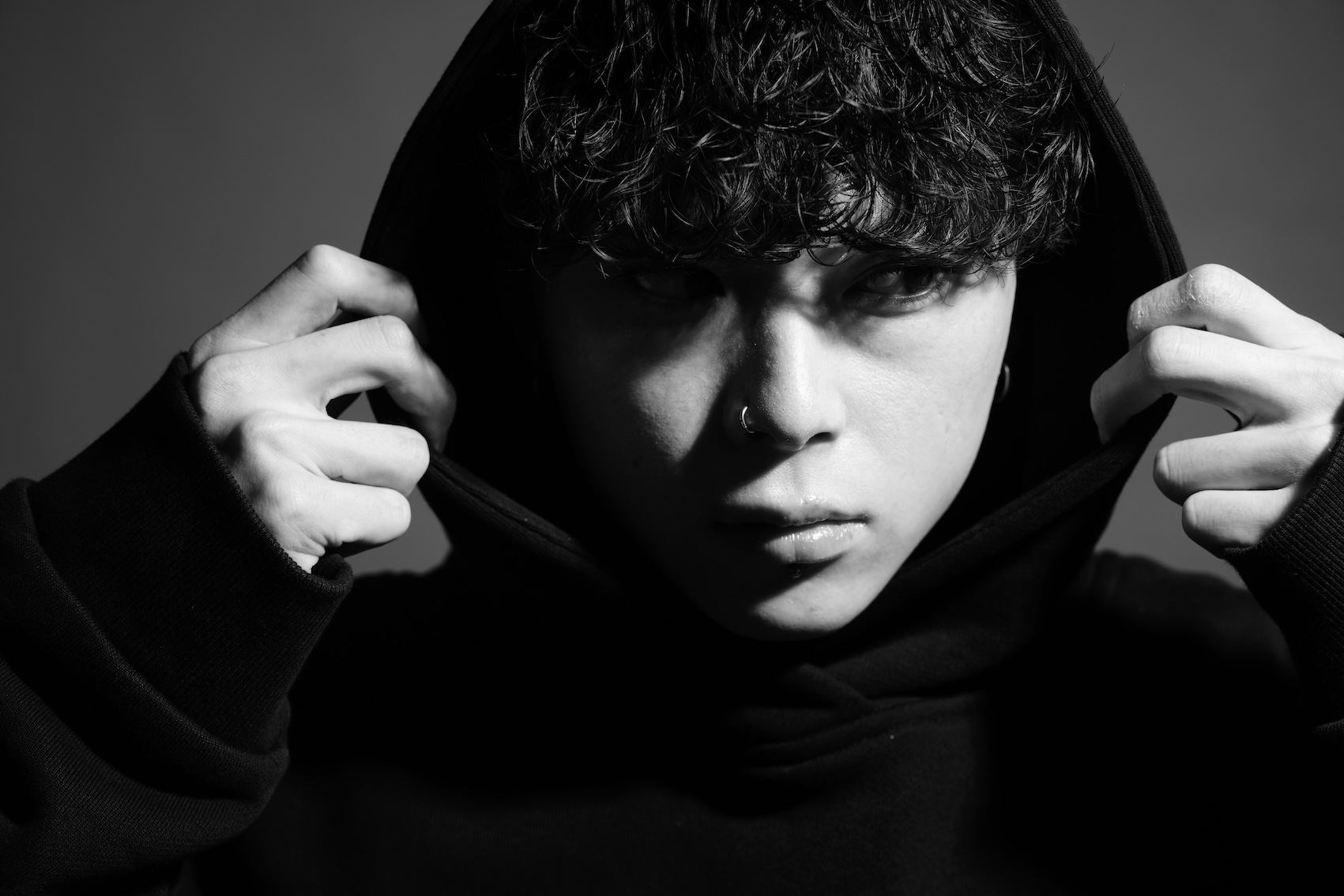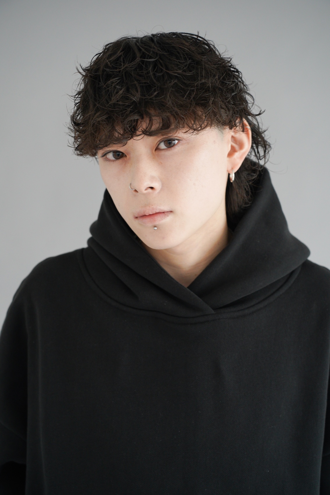 「個人的に80年代のロックとファッションが好きで、70年~80年にデビッド・ボウイから始まったロックと、ファッションの時代で流行った髪型を近未来風にリバイバルしてみたくやってみました!」黒基調のモノトーンスタイルのイメージソースがグラムロックだったとは!「今回は70~80年代のロックの髪型がテーマですが、90年代のヒップホップのビースティーボーイズがマレットヘアをディスったことから世界一ダサい髪型となりましたが、その2つをビーフさせるかのようにヒップホップのストリートなファッションとロックの髪型で合わせてみて、これが近未来のスタイルだ!と表現しました服はentire studioのセットアップとNIKEで近未来なモードストリートを表現してます!」
