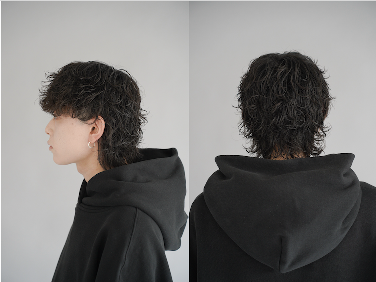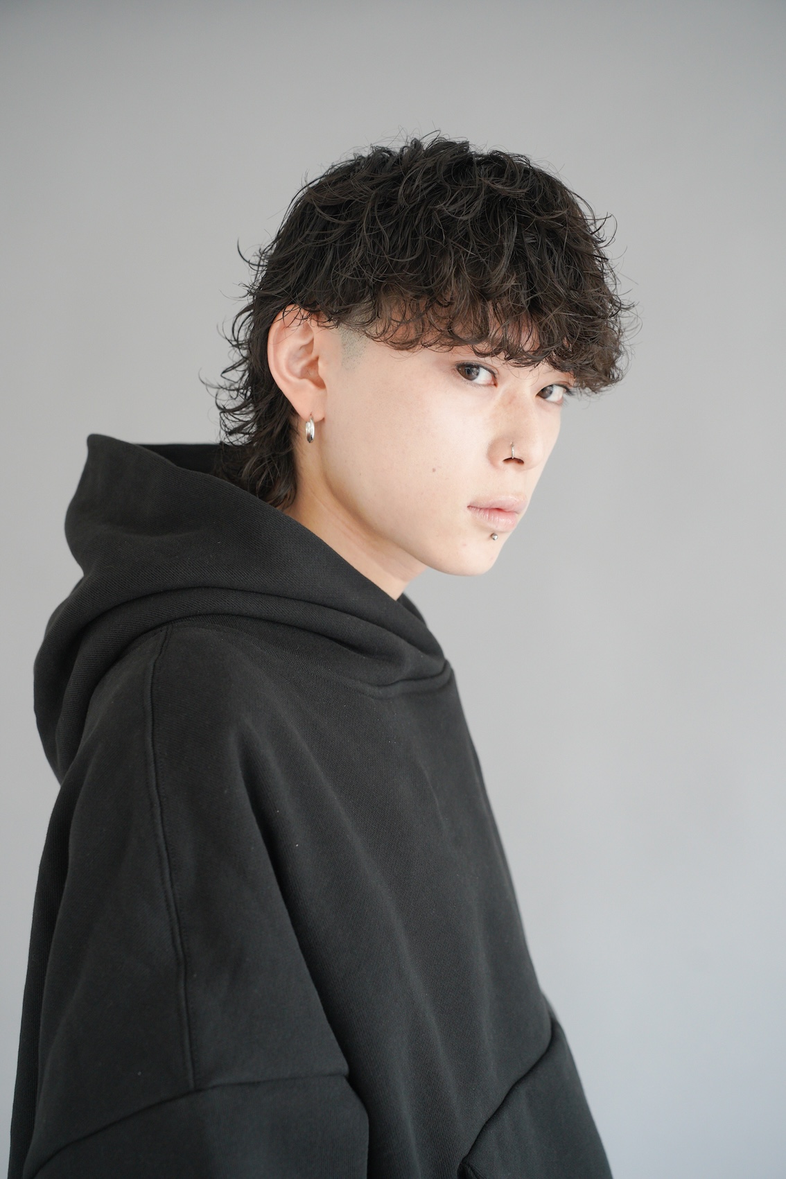 長いえりあしとチラ見えしてるサイドのフェードカットがポイント。サイドはフェードカットを入れて、フロントとネープの長さが同じになるようにカット。モヒカンラインを頭の丸みに合わせて、セイムレングスでカットし、レイヤーは耳の位置を起点にして扇状に入れている。パーマは、大きめのロットでネジって平巻きを細かく入れて、ランダムなハネ感とボリューム感を作り、外国人のクセ毛のような柔らかい質感を表現している。