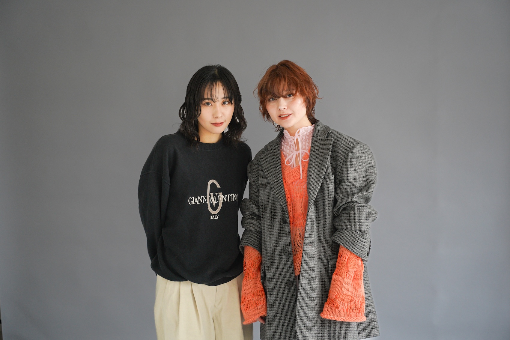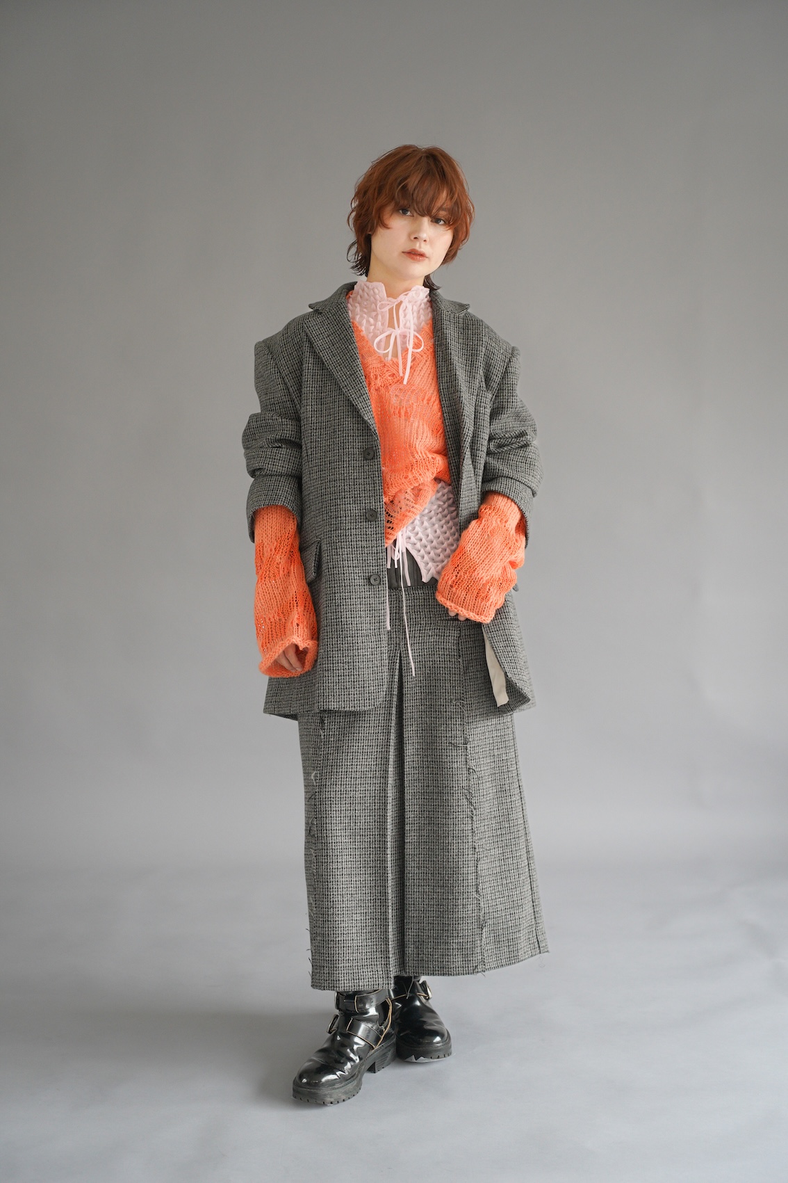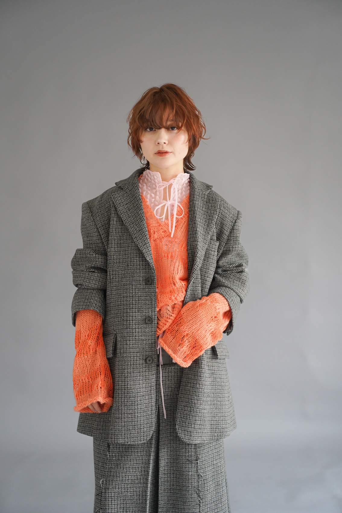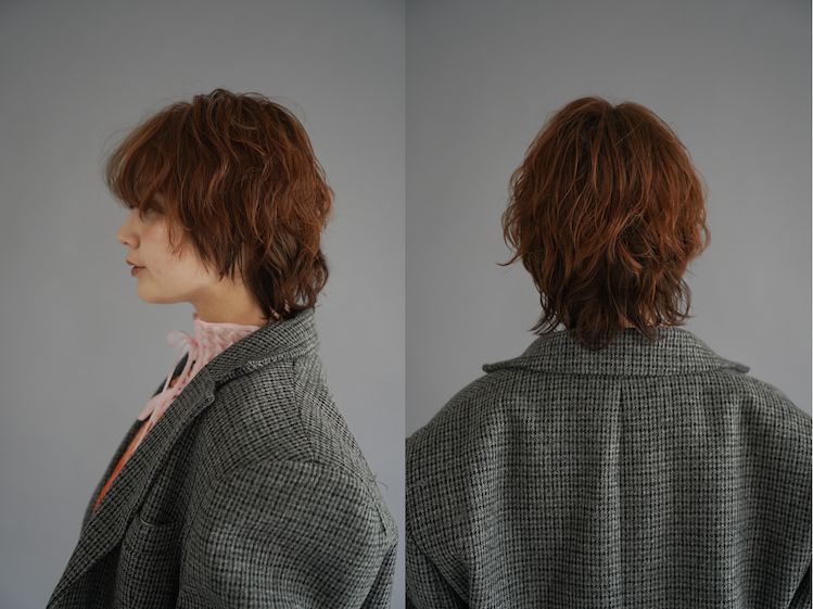 このテーマの芯は「時代に左右されず古くから愛され、不要なものを徹底的に削ぎ落として、形・素材・バランスアンドの少ない要素で美しさを成立させる「minimal」の強さと、好きなもの、大切にしているものを「freedom:自由」に表現できる人になりたい」という担当のホシノさんの想いにある。ヘアについては「奇抜な色や形よりも、素材の質感が主役の軽さと柔らかい動きのあるウルフです。無機質でミニマルな土台に、自然にできた遊び心のあるハネが一つ強いポイントです」。ファッションもヘアと同様に「素材×質感」を意識してスタイリングしたという。「ミニマルなグレーのセットアップで重い印象にならないように、遊びのある質感のニットをレイヤードし、テクスチャーアートなコーデに仕上げました。ニットの袖が長さ、ピンクの紐、ジャケットをゆるっとだるそうに溜めて羽織るなど着こなしでも遊びをプラスしました!」
