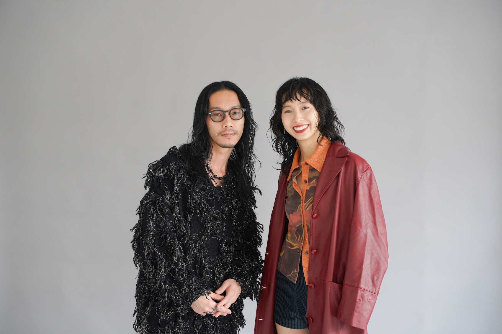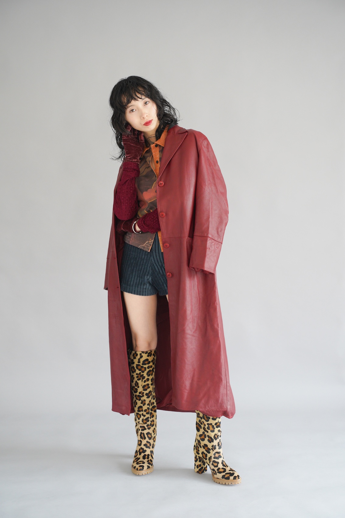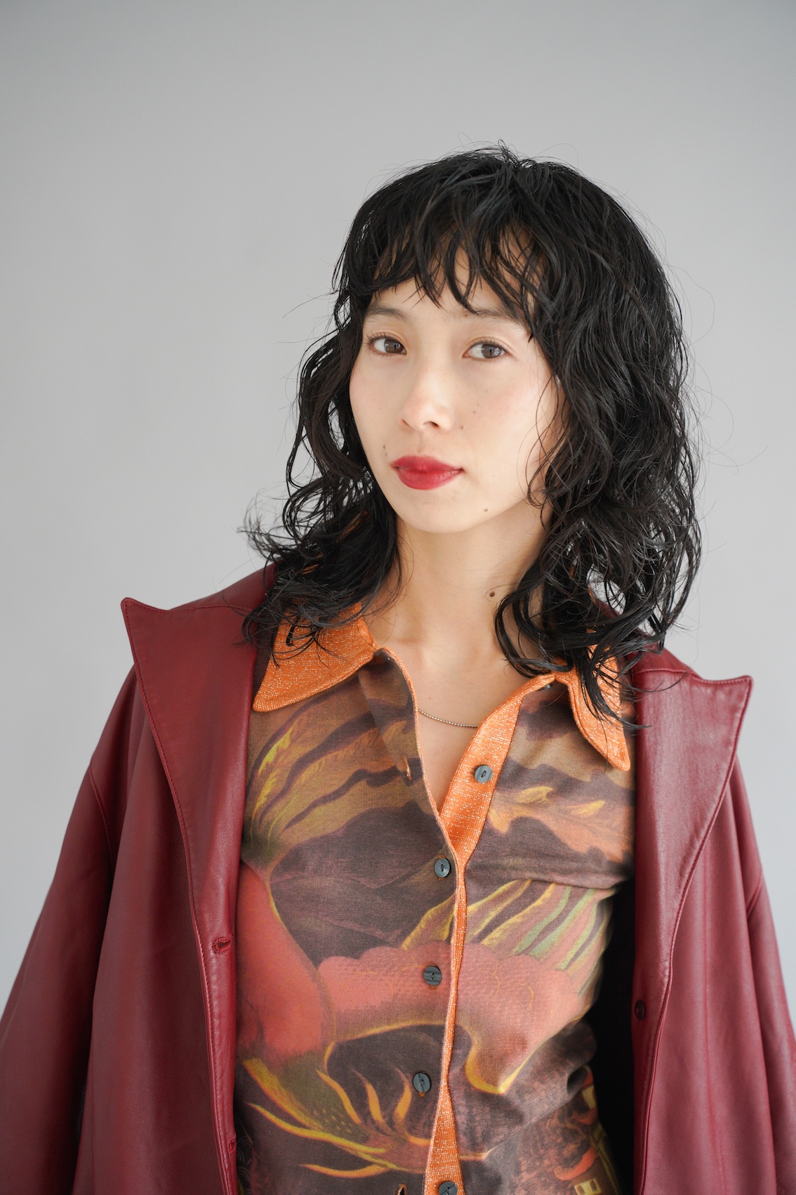 「サロンワークでもカルチャーやバックグラウンドを感じるスタイルを常に意識しています。今回も自分の1番好きな60〜70sのカルチャーを今に昇華したスタイルをつくりたいと思いました」。重めのウルフにハネ感のあるスパイラルパーマをかけて、レトロモダンな雰囲気に。スタイリングはウェットでラフにキメ過ぎず。「ファッションも60〜70sのカルチャーを今に昇華したレトロモダンスタイルです。全てvintageのアイテムで、赤のレザーロングコート、レオパードのロングブーツ、ベロアのグローブの相性がお気に入りです」