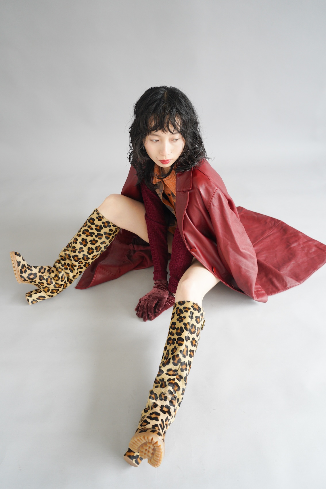コート/Italian Vintage Leather Coat。2万6400円、トップス/”Custo” Printed Knit Shirt。1万5400円、ブーツ/”OLIMPIADI” Leopard Leather Boots。2万9700円、グローブ/Italian Vintage Velour Gloves。6600円(すべてMONK @monk_womens)