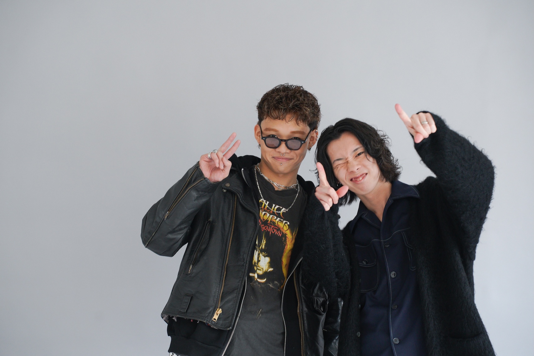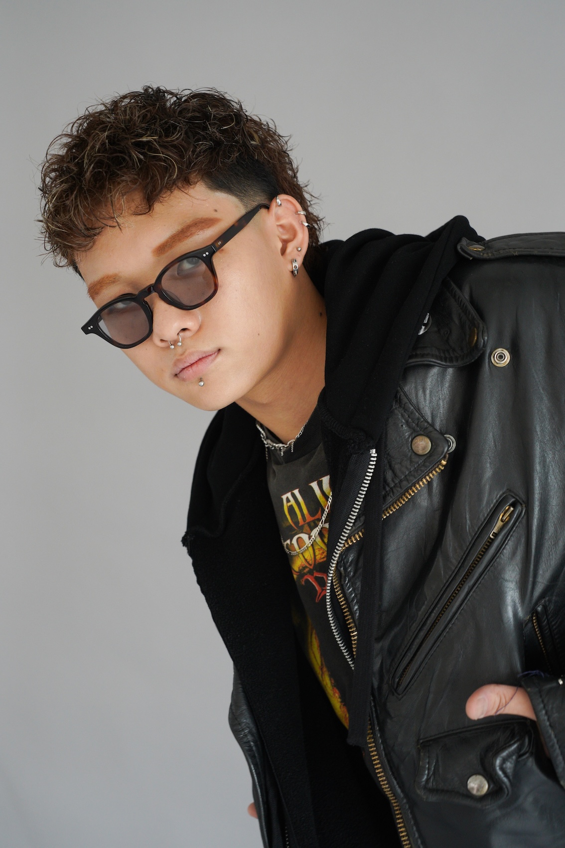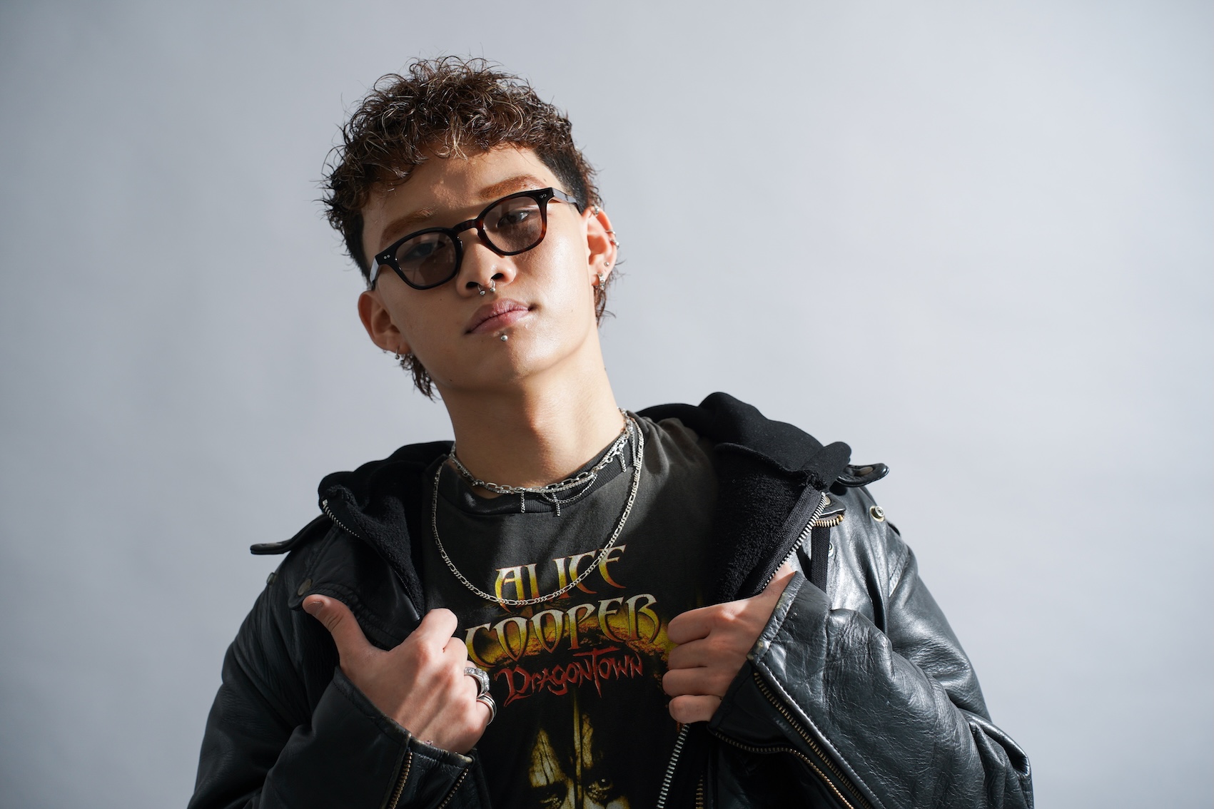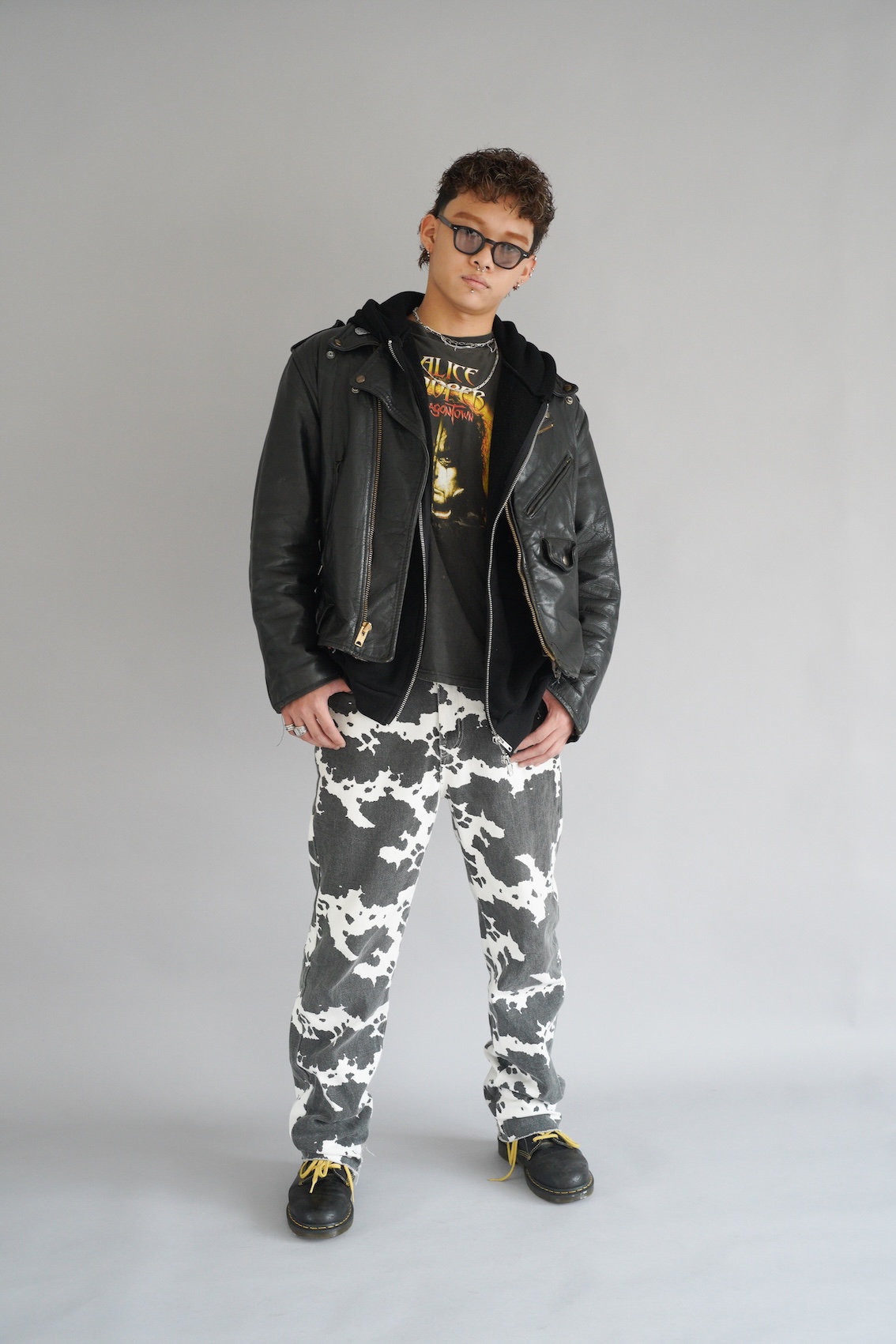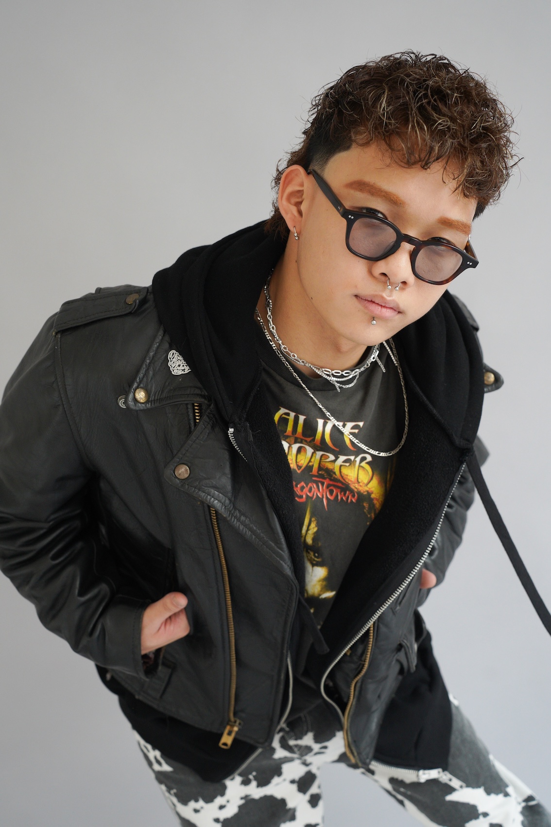 一見いかついけど「茶髪スペインカールと流行のマレットヘアを掛け合わせたら面白いんじゃないかな、と。80年代のリバイバルで、新しいマレットヘアを提案したいと思いました。スパイキーショートやスペインカールに飽きている方に提案したい2026オススメのヘアです」という意欲作。ポイントは「クルッとしたカール感と、テーパーフェード。柔らかいブラウンカラーにアクセントで極細ハイライトを入れた、無骨で男らしいネオマレットヘアです」と解説してくれた。ファッションも変にキレイに外したりせず、無骨さで意思を統一。「80年代ロックバンドからインスパイアされたコーデです。無骨さを際立たせるレザーにバンドTシャツ、カウ柄のパンツで当時のような派手に大胆にしました」