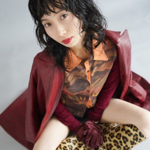 「プツッとシンプルなボブの中に、骨格に合わせたノーズラインのアクセントがポイント。ヘアの動きが少ない分、コントラストの効いたカラーデザインでバランスをとりました」。ミルキーベージュ×ダークグレーのコントラストカラーがおしゃれ。メンズライクなオーバーサイズのジャケットに、ピンクの女性らしいスラックスを合わせたジェンダーレスなファッションもマッチ。