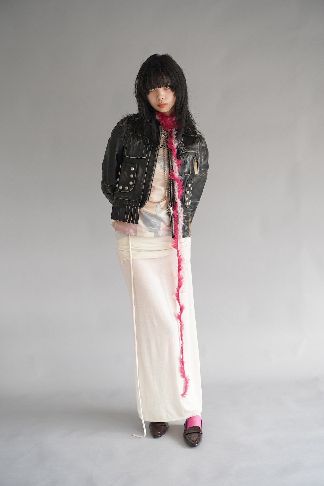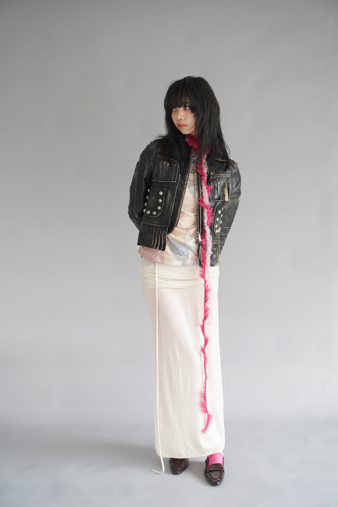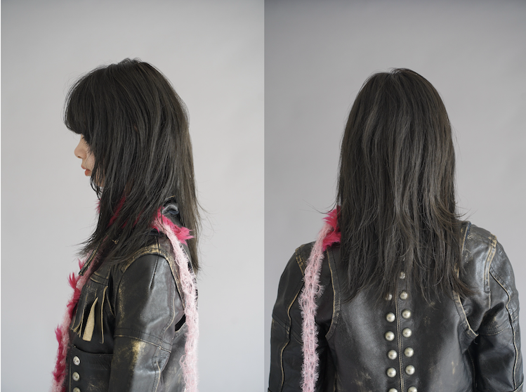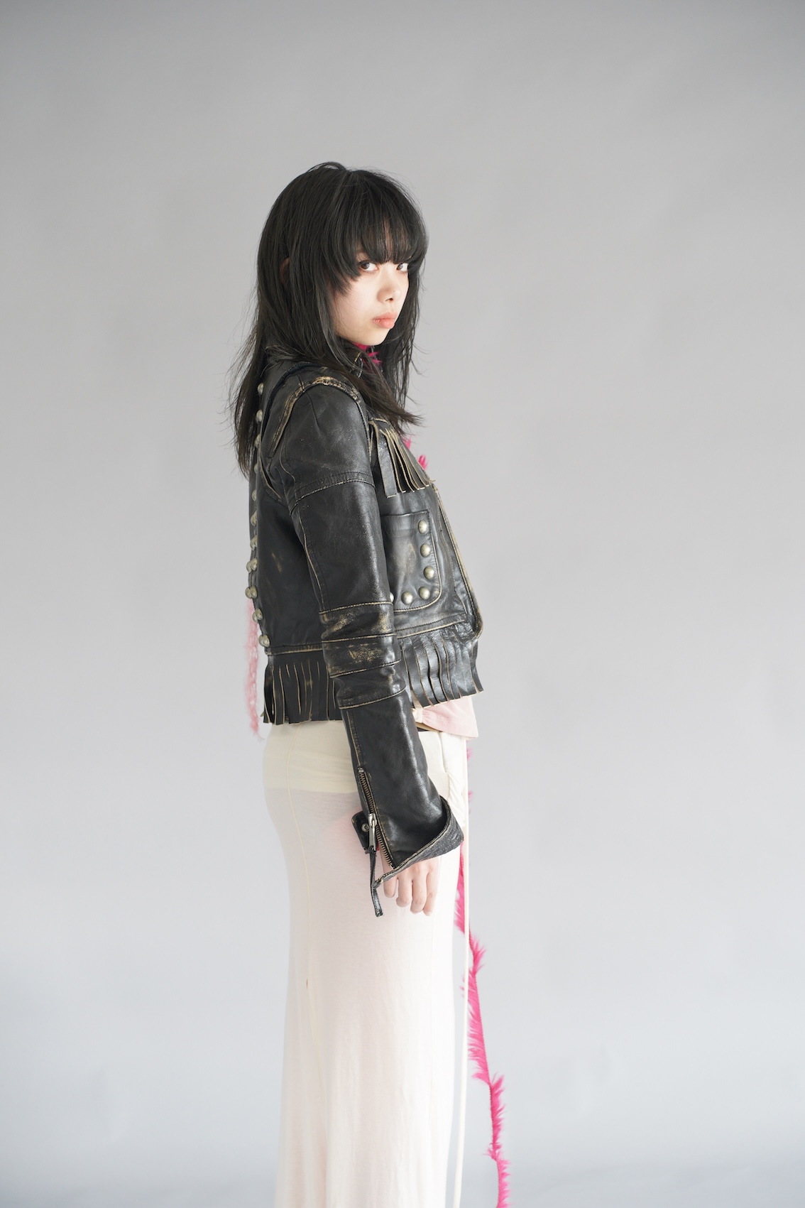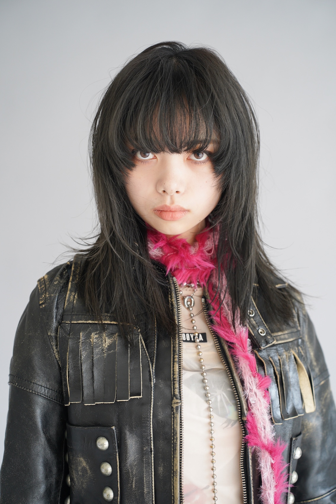 唯一無二感がある佇まいから惹き寄せられる。「流行りでは無く、自分の好きなヘアやファッションをしている子が好きなので」という思いがあって手がけられたスタイル。ヘアは「秋なので重めのマッシュバングにしましたが、全体的に印象が重くなりすぎないように後ろはレイヤーをたくさん入れました。ファッションは、タイトなシルエット、シアーな質感に硬めのレザーがmodsっぽいヘアと合わさったら可愛いかなと思いました」。強い存在感のあるスタイルだけど、意外性のあるインナーが印象を和らげてくれる。