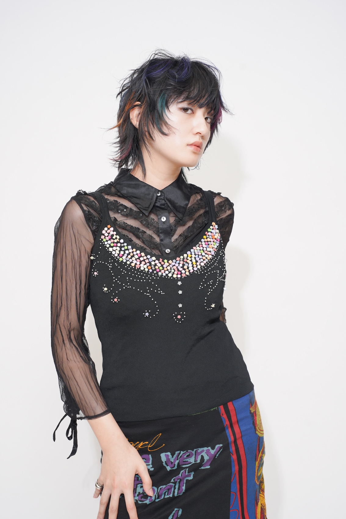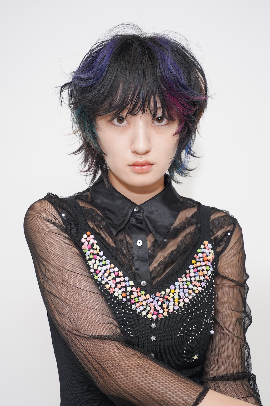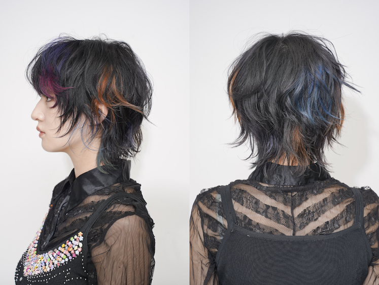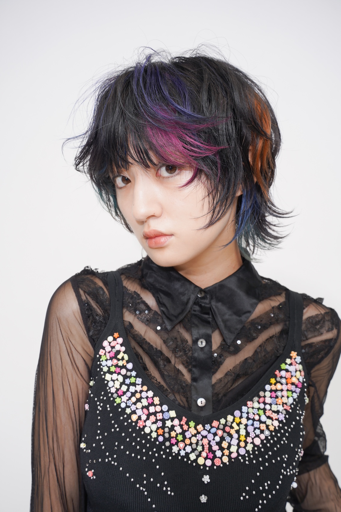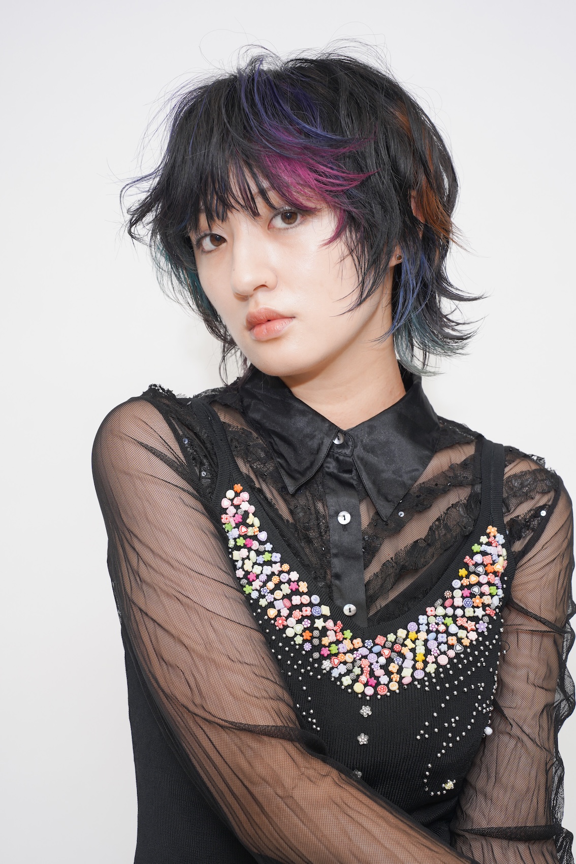 「ファッションのビジューに合わせたヘアを作りました」トップスのビジューとコーディネートされたような、様々な彩のカラーが特徴。「最近だとローライトデザインが流行っていると思いますが、highと lowの部分を逆にすることでcolorの部分に注目を集めることがポイントです」発想の起点はやはりトップス。「ビジューのついたトップスに一目惚れをしてこれにマッチするヘアを作りたいと思いました! ファッションもヘアもベースはBlackに統一しそこに色遊びをさせています!」