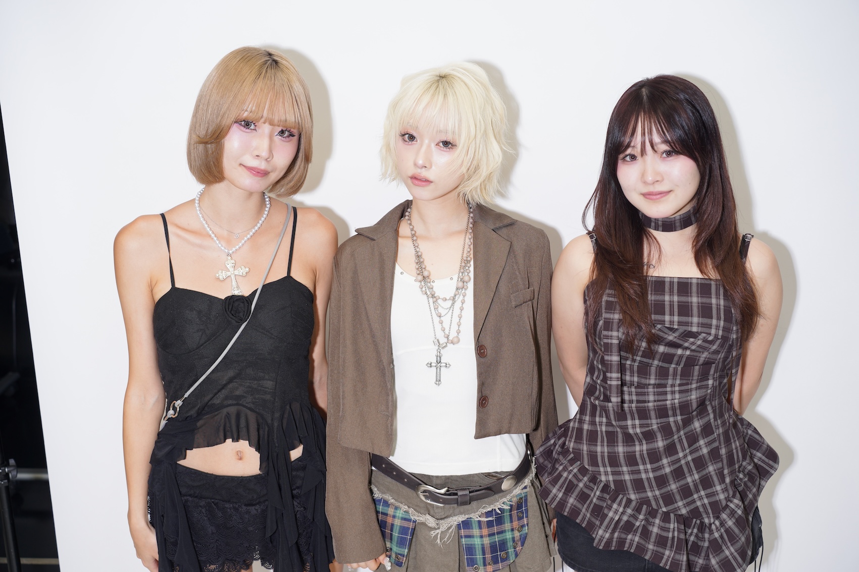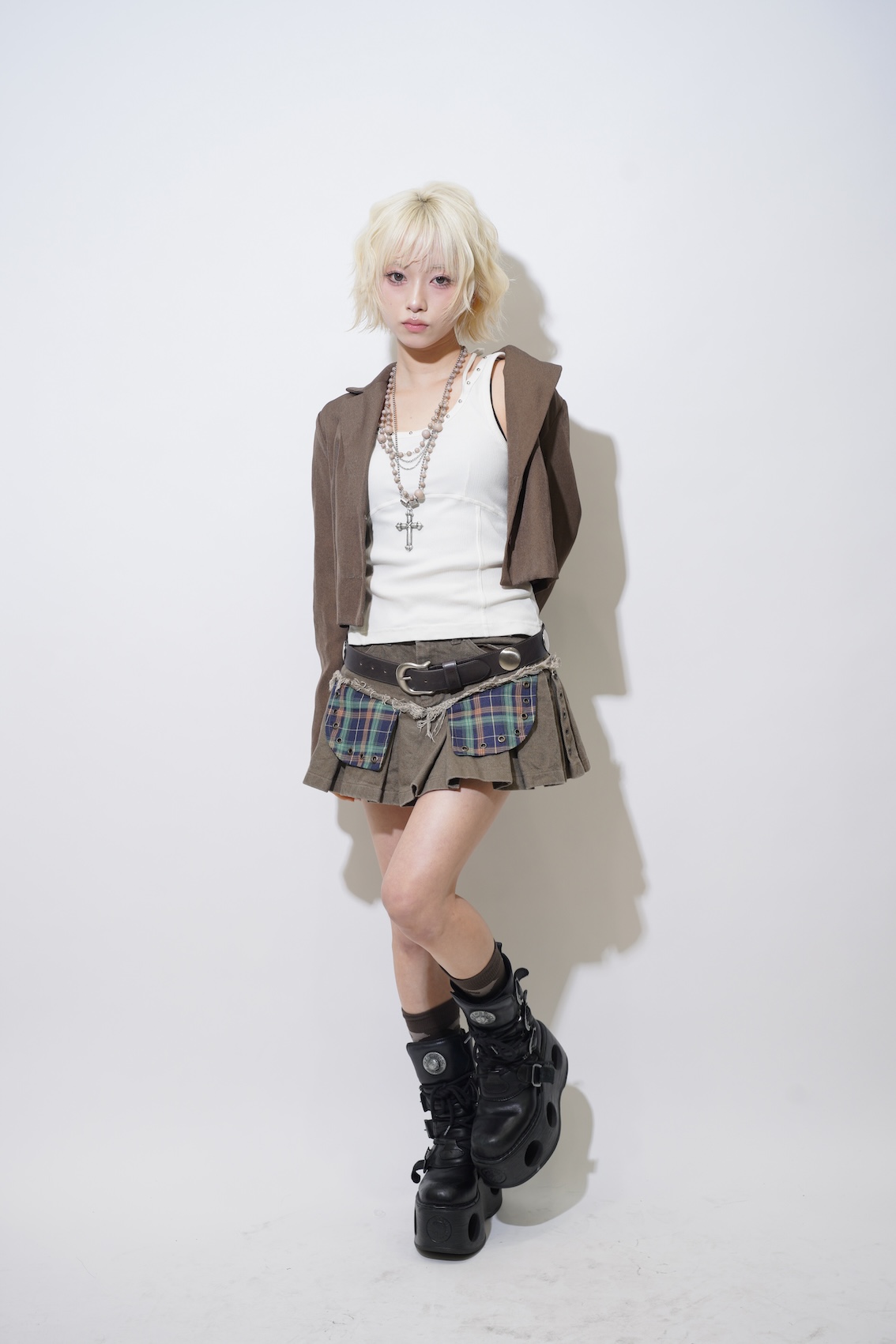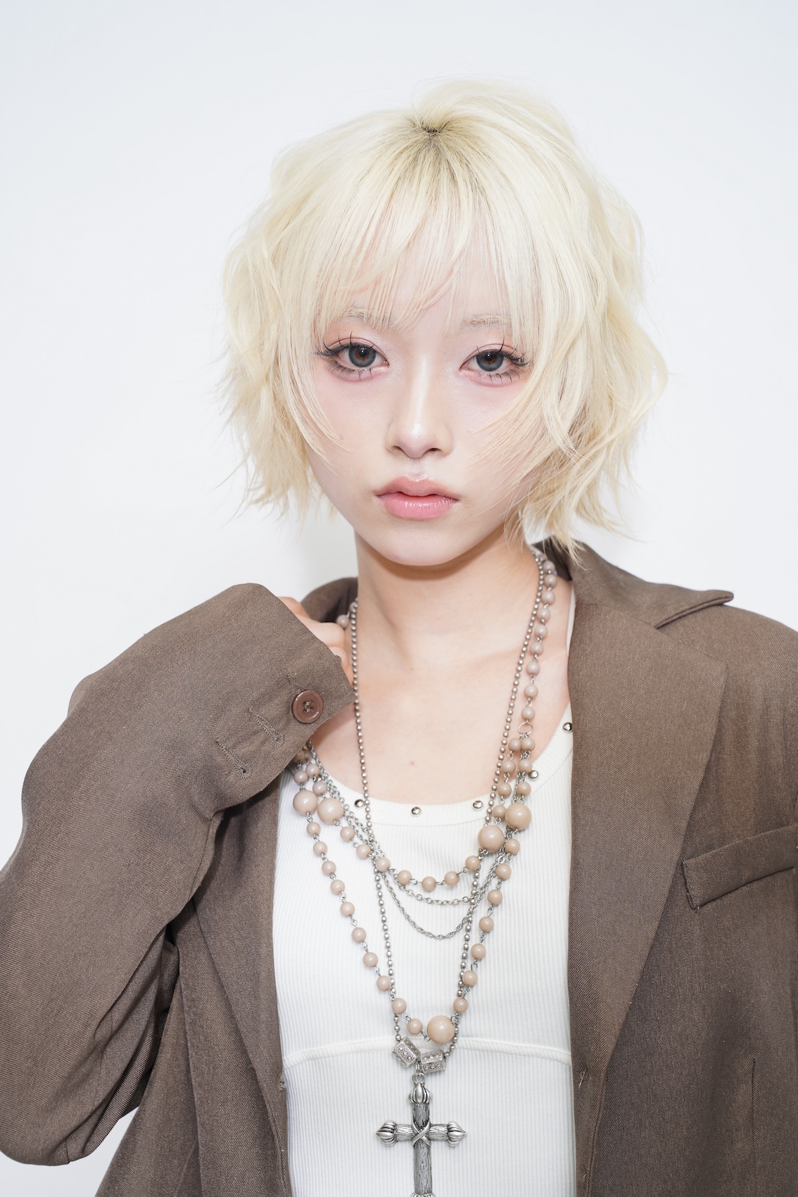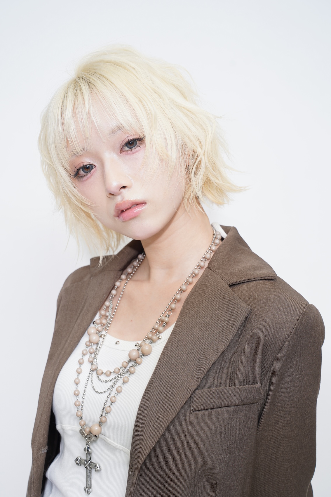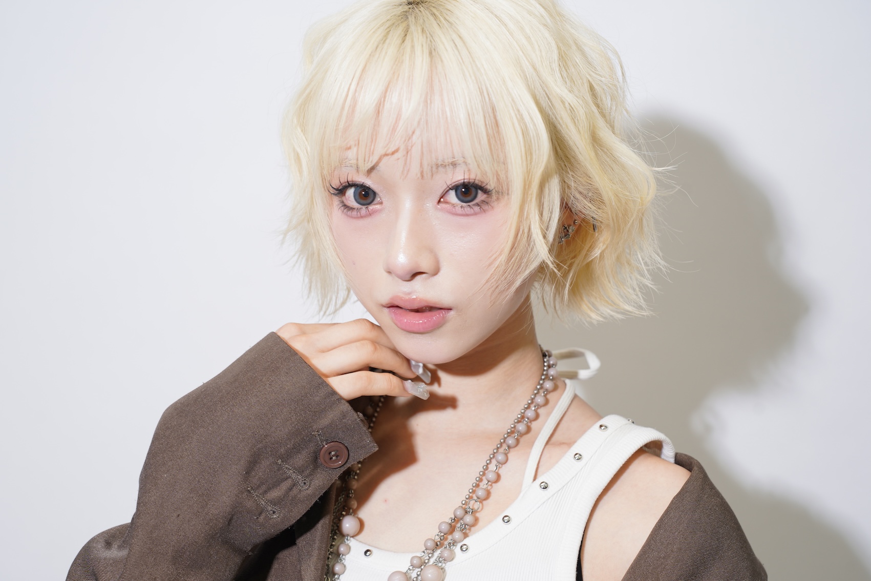 「根元から毛先まで細かなウェーブ、ツヤ感があり自然なボリューム感。モデルさんのやわらかい髪質とレイヤーを活かして、動きのあるスタイルを作りました。ベースは外ハネで動きを出し、レイヤーのニュアンスで遊び心をプラスしました。前髪は数本だけ動きを出して後ろの髪の毛との統一感を出しました」ハイトーンのボブにやわらかい動きをつけて、キュートなムードが爆上げ!「ファッションはジャケットやベルトにブラウンを取り入れて秋っぽさを意識しました。ヘアにボリュームがあるので、ファッションは全体的にタイトめにまとめて、ネックレスやスカートのチェック柄でインパクトを出しました」