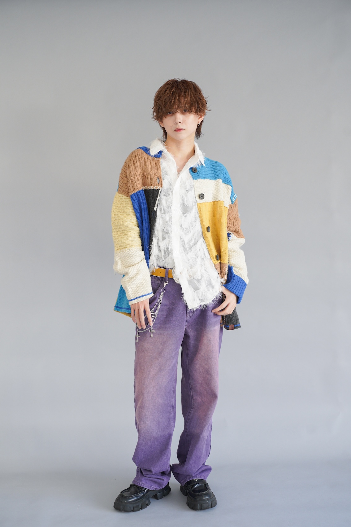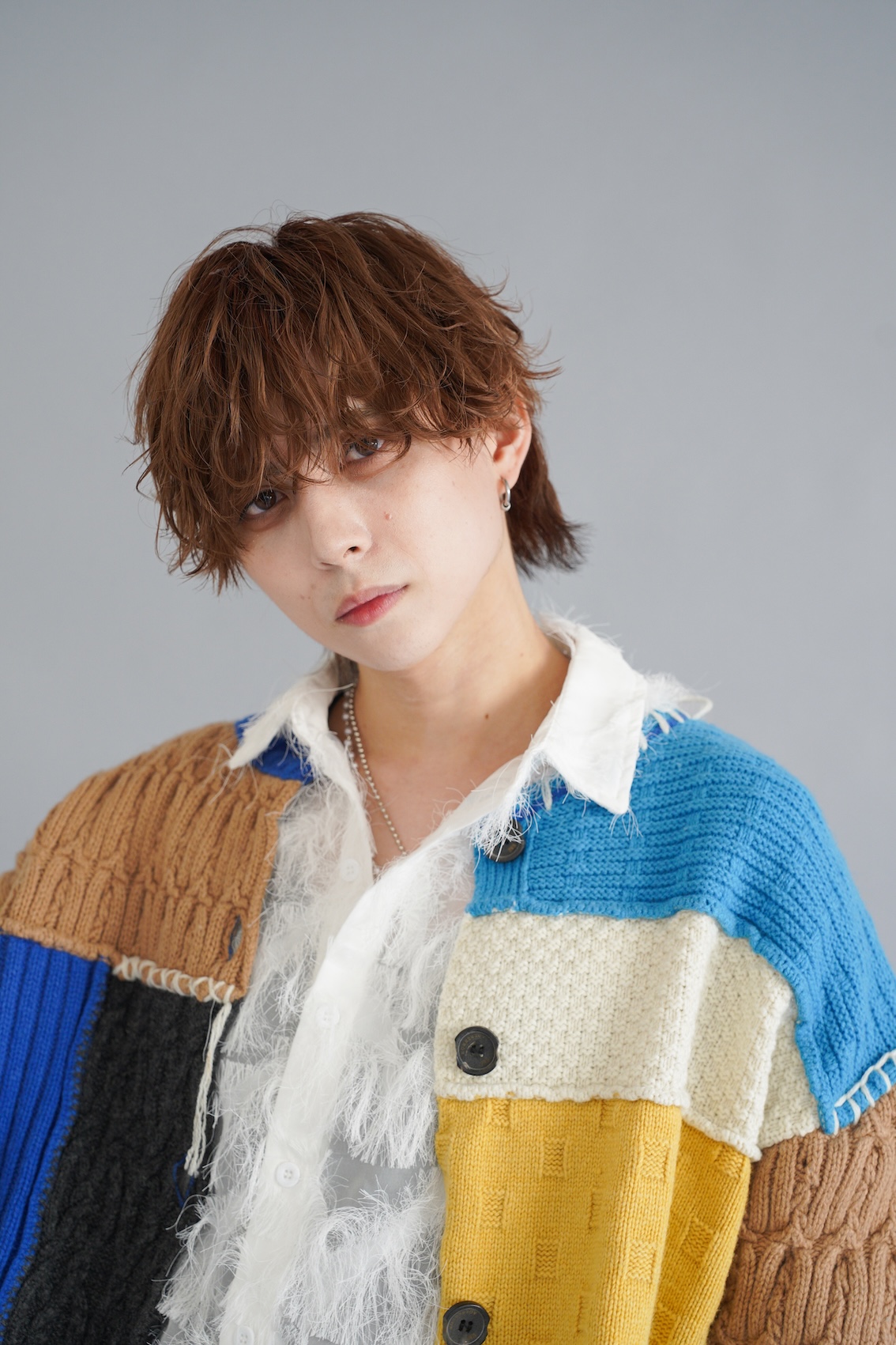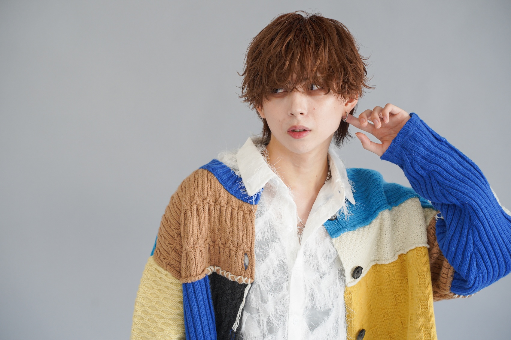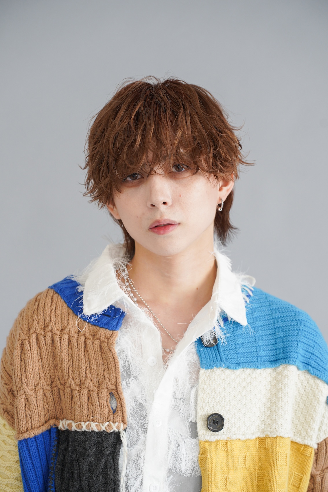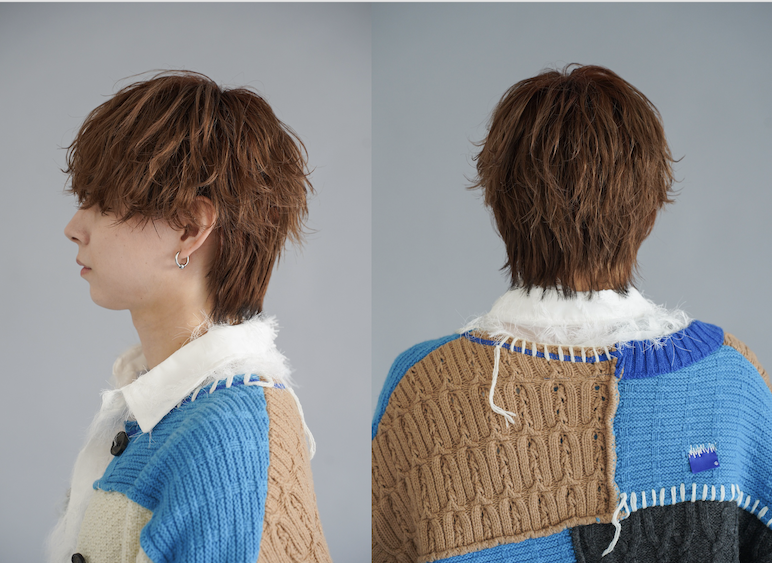 タイトル通り、メンズマッシュに新しいデザインをとりいれた意欲作。「ラウンドシルエットにエア感をプラス。やわらかいけど芯がある。エアリー感のある柔らかいS字カールで秋の葉が揺れるイメージで無造作感を意識しました!」。意識しているのは女性美容師としての目線で「秋を感じさせるやわらかなブラウンカラーで、女性メンズ美容師目線でカール強めの無造作ヘアセットで仕上げました。顔まわりに透ける髪の毛と目周りに落ちるカール感で大人な色気を出しています」。フリンジのシャツに配色がきれいなニットでコーディネート。「フリンジシャツの存在感が消えないような組み合わせにして、ヘアセットで感じるエアリー感を服装でも合わせてみました!」
