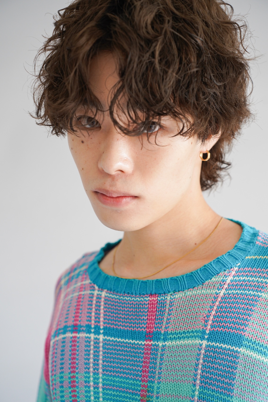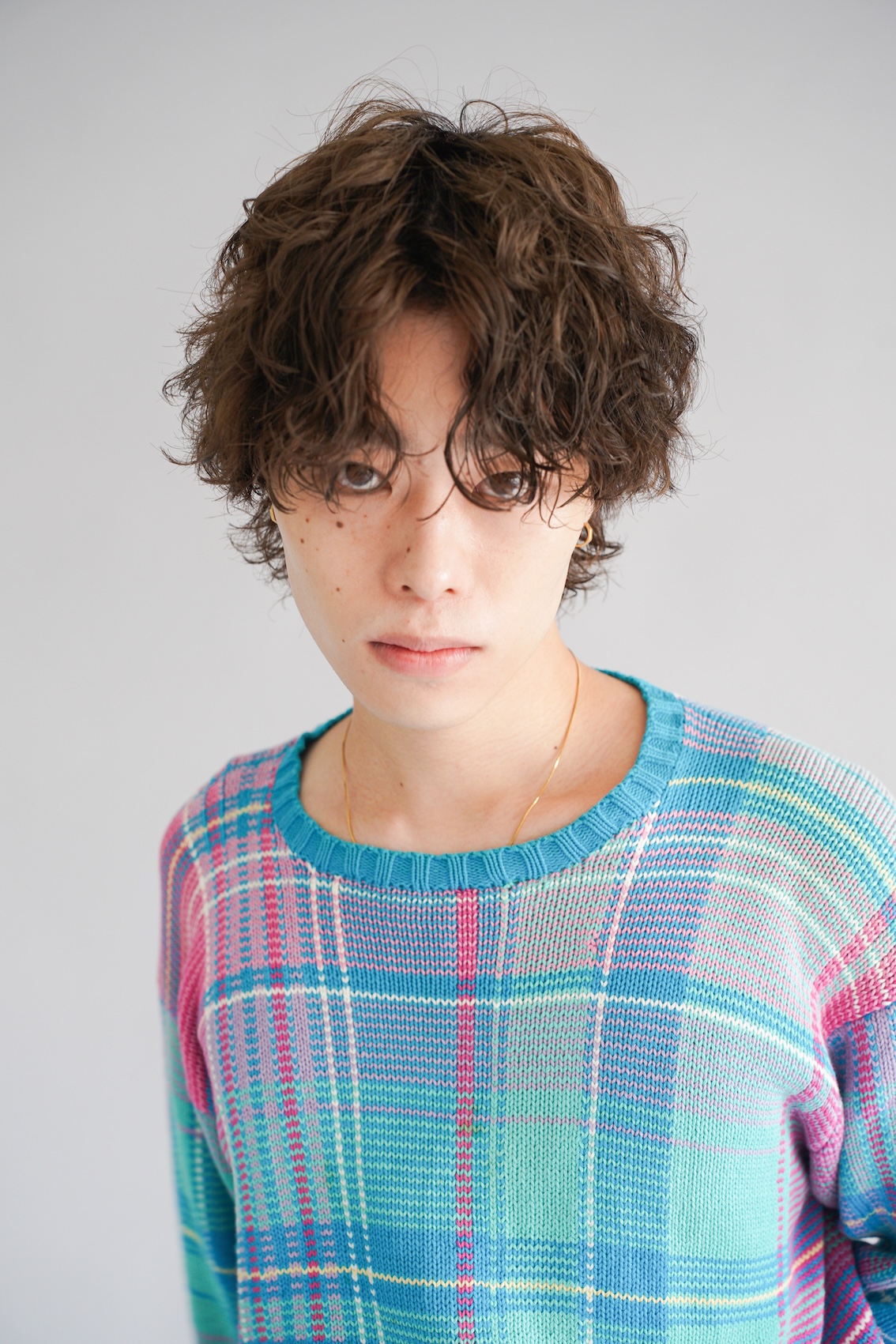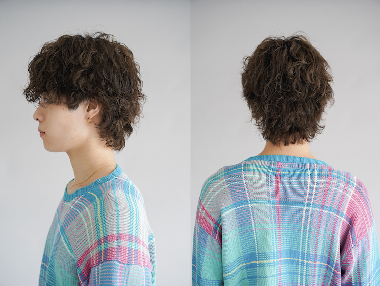 風になびくようなドライな質感が特徴。くせっぽく、計算されたパーマでラフさを。カラーは、落ち着いたくすみトーンで服の色を引き立てる。パーマは、トップはグリーン縦巻き、ハチ下は平巻きと逆巻きを交互に。さらにえりあしはピンパーマをかけている。