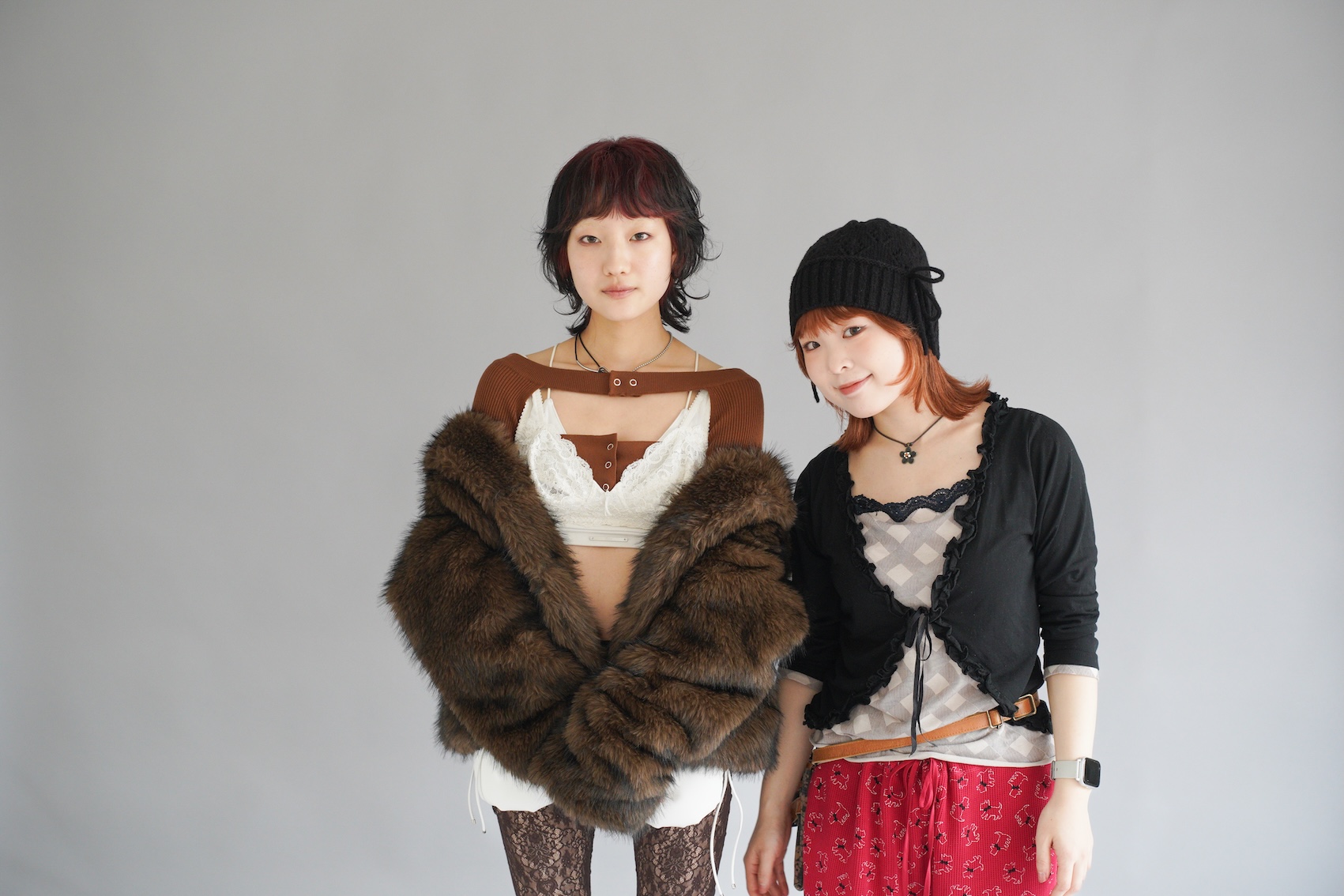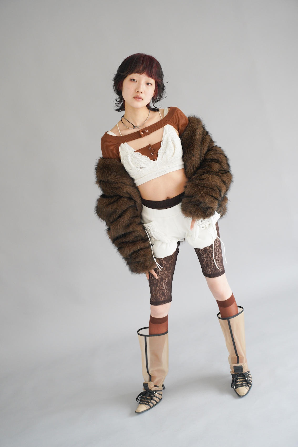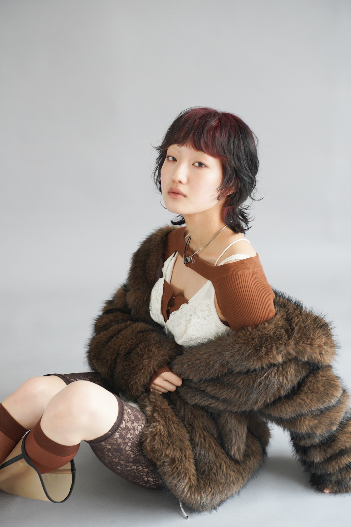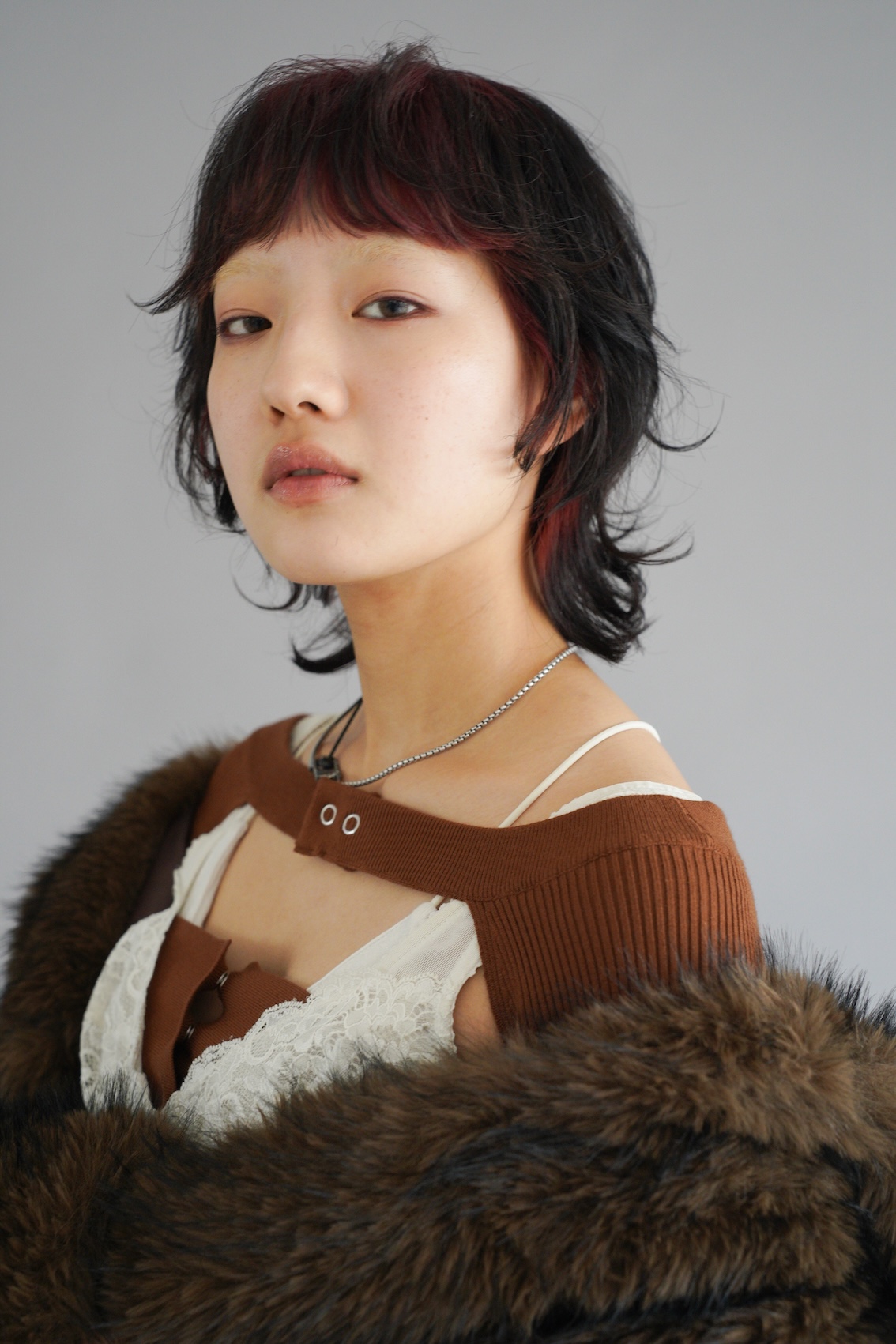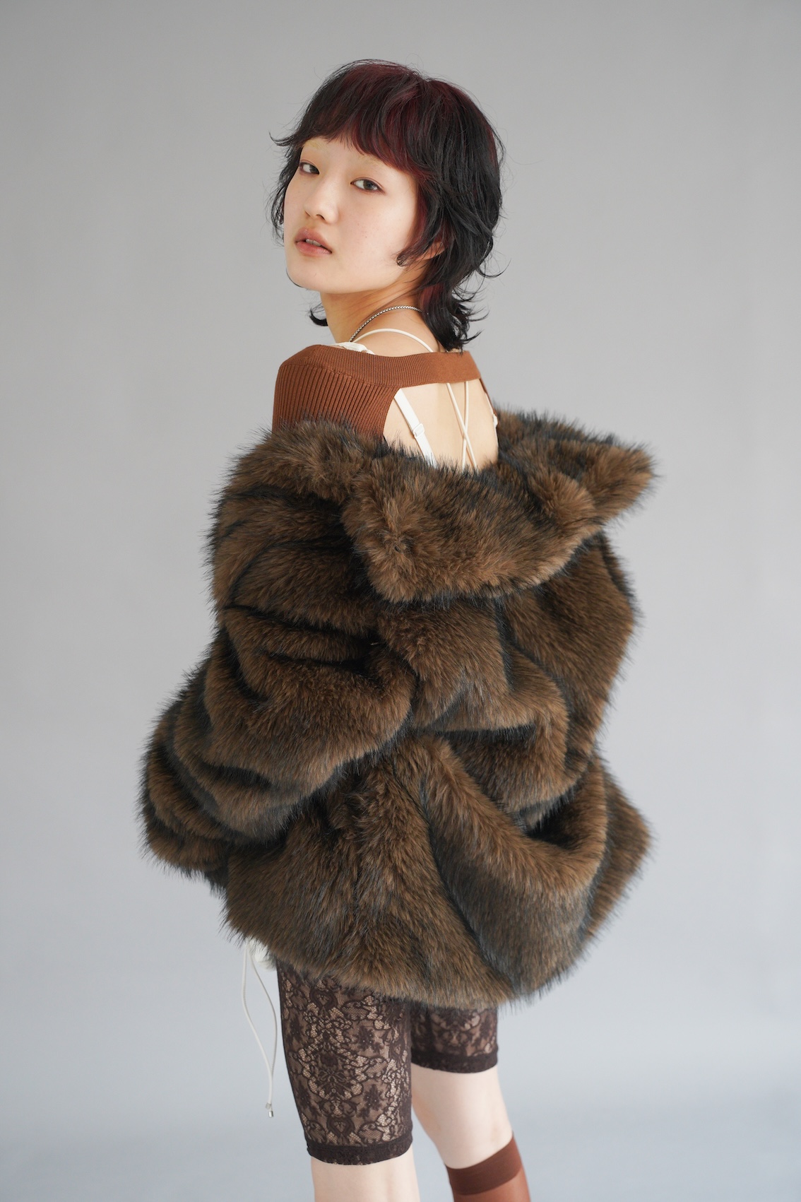 「来年のトレンドに柄物が含まれていたのもあり、動物に視点を当てました。動物が草原を駆け回る、その一瞬の動きをヘアに落とし込みたい、”躍動感”が欲しいと思いました」という、独特の角度からアプローチしたスタイル。「毛束を大きく動かすことで、靡くような毛の動きと躍動感を表現し、全体的に遊び心のある”ハネ”を入れました。前髪のセンター部分は特に繊細に作り込み、カラーのコントラストが分かるようにしています」。ファッションはコートでコンセプトを踏みつつ「ラグジュアリーな物やレースを取り入れて、大人な女性像を創り上げました。同系色で素材の違うアイテムを組み合わせ、ヘアとマッチさせても重すぎないようにレイヤードさせシンプル、かつヘルシーにしました」
