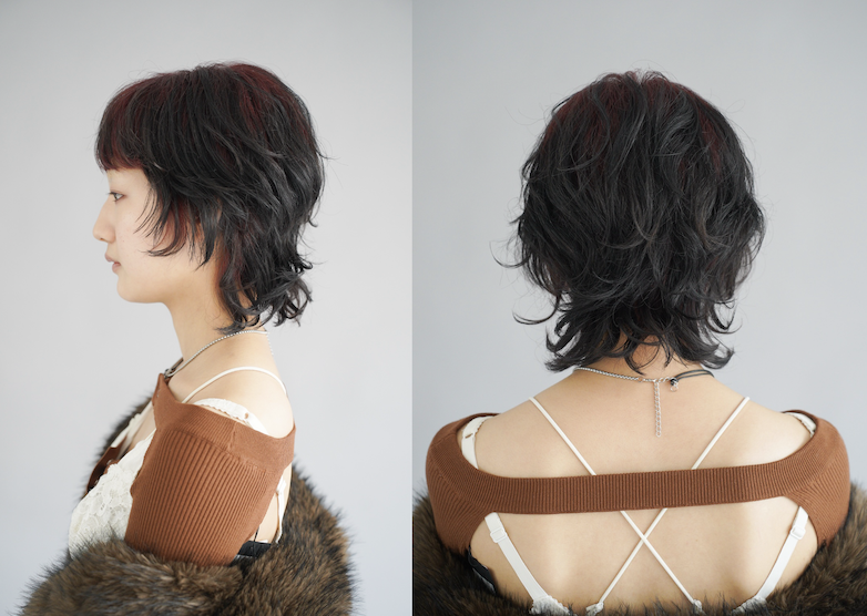 肩に当たって跳ねるくらいの裾の長さを残しつつ、全体にしっかりレイヤーを入れて、クセが動きやすいようカット。カラーは、髪の毛先の動きがわかるようにするため、根元のみに。すると、より立体感が生まれ躍動感が演出できる。色味は、顔色の血色が良く見える暖色系を入れて、少し上品にするためにワインのような深いボルドーを。
