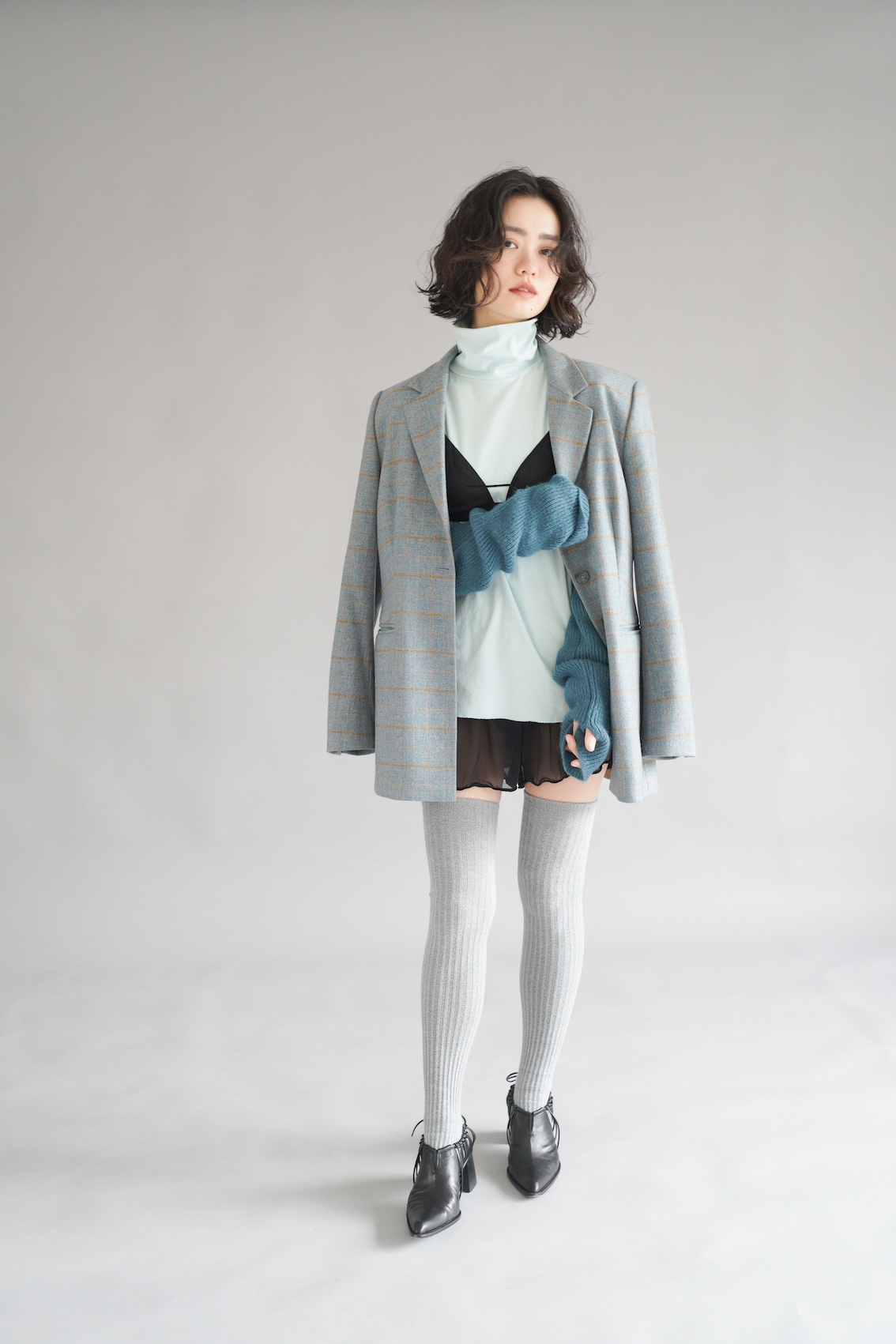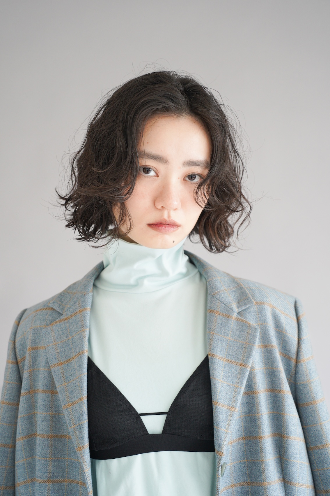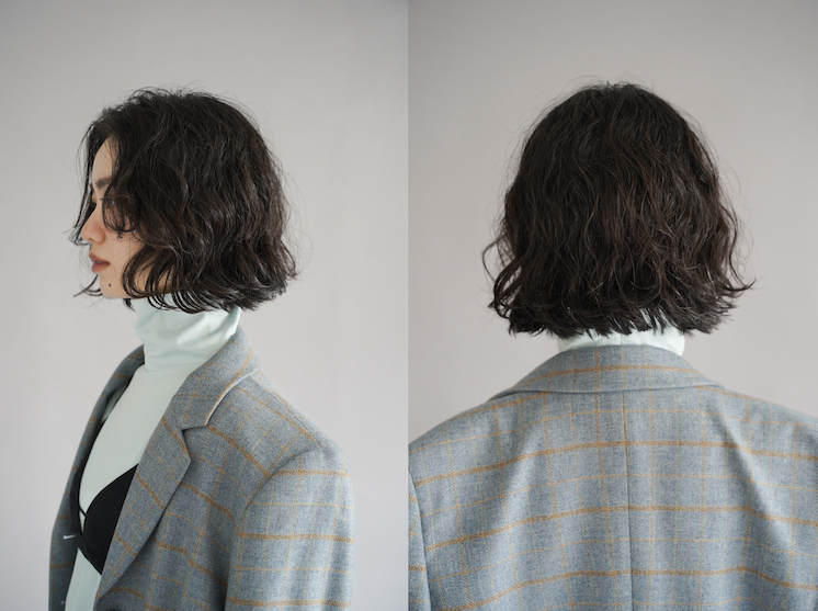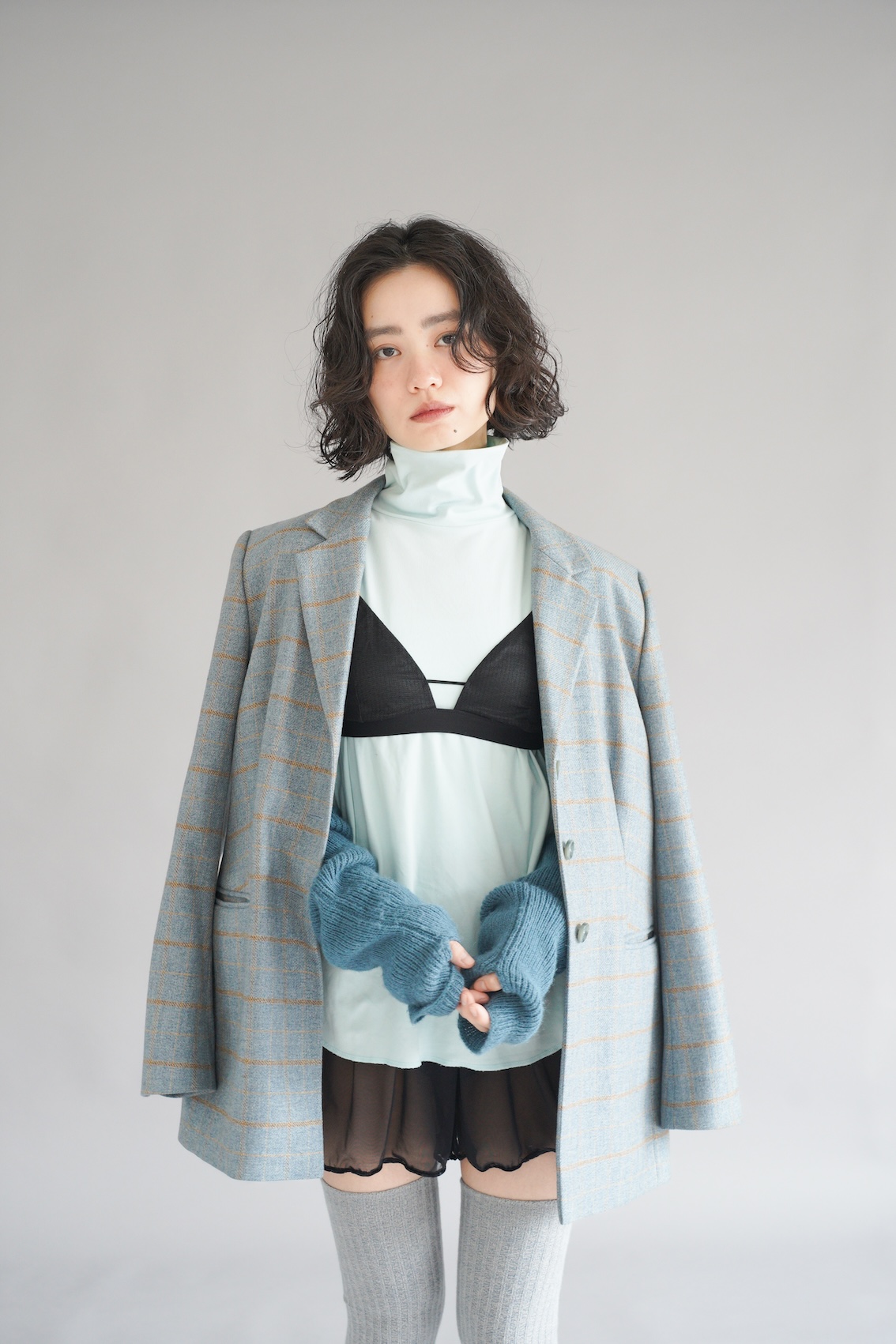 「クセがある方でも短めのスタイルを楽しめるように」というお悩み解決もする、機能的なおしゃれボブ。ポイントはカット。「パーマのようなクセが出やすいように、カットで調整しています」というワザは、悩んでいる人はぜひ試していただきたいところです。ファッションは水色で色味を統一したコーデ。アームウォーマーがアクセント。「レースなどの女性らしいアイテムを取り入れつつ、ヘアとのバランスみてジャケットスタイルで締まりを作りました。大人かわいいスタイルです」。