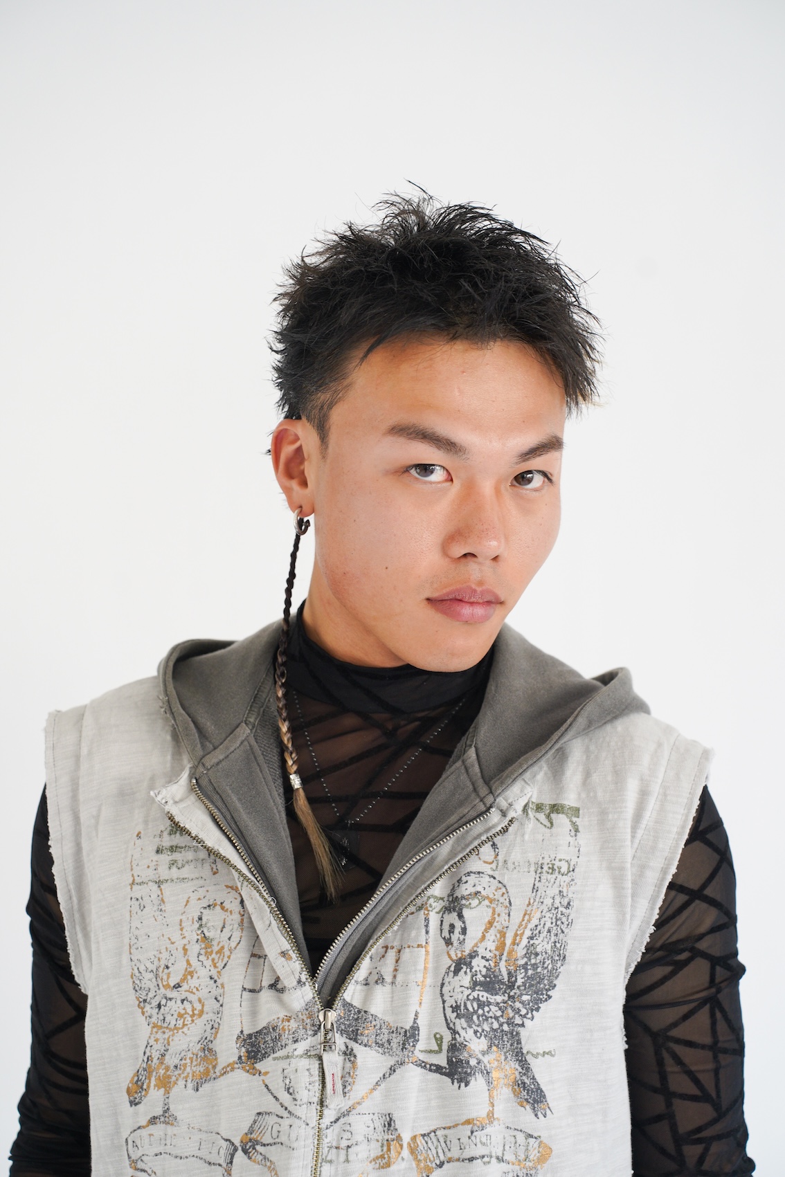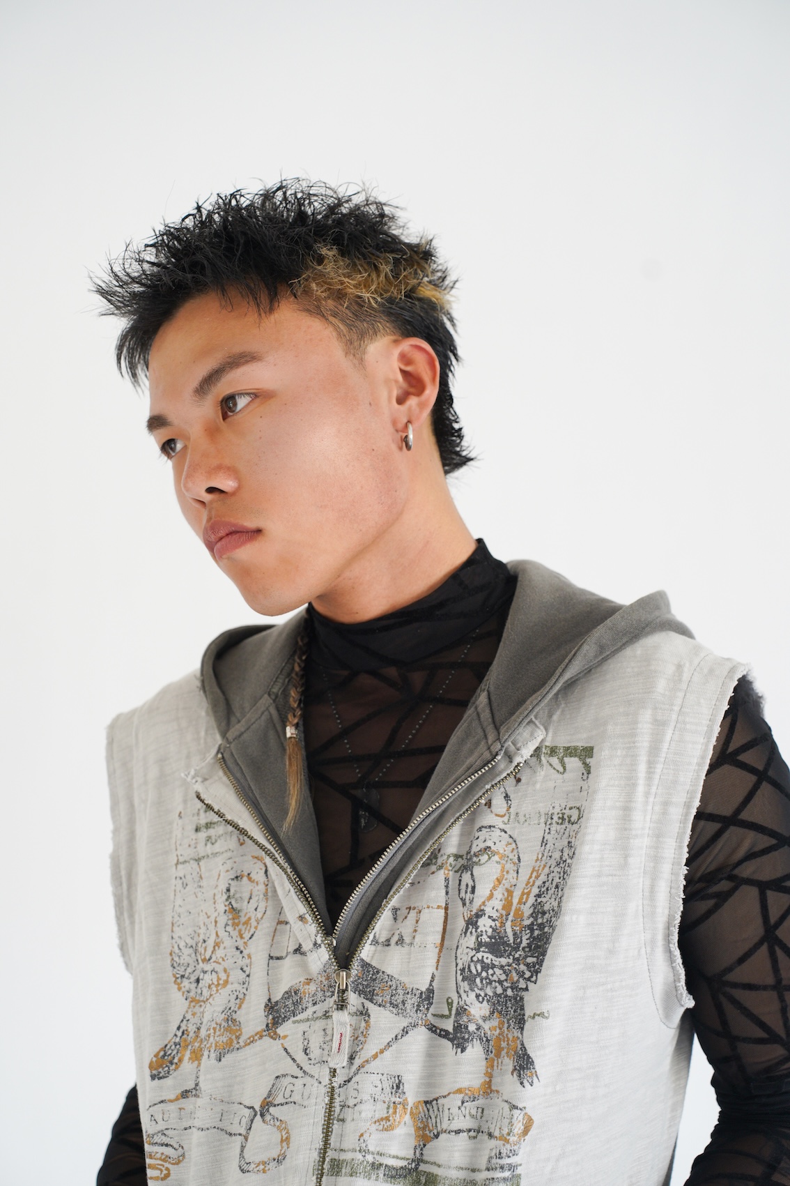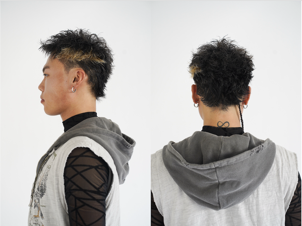 「特殊へアやアヴァンギャルドな要素は、どうしても『作品向け』『非日常的』になりがちですが、今回はそれらを日常のストリートスタイルに落とし込みたいと考えました。強さや個性を持ちながらも、実際に街に存在できるリアリティを持たせることで、ヘアとファッションの新しいバランスを表現しました」という、理想的な進展を狙ったスタイル。「サイドのみ刈り上げたモヒカンショートに、ラフなテクスチャーを重ねることで無骨さと抜け感を両立させました。ポイントでブリーチと編み込み (ブレイズ)を取り入れ、特殊ヘアのパーツをアクセサリー感覚で配置しています。主張しすぎず、スタイル全体の中で自然に存在するヘアデザインを意識しました」。ヘアとファッションが主張し合うのではなく、互いを補完し合う関係性を目指したのも好印象。