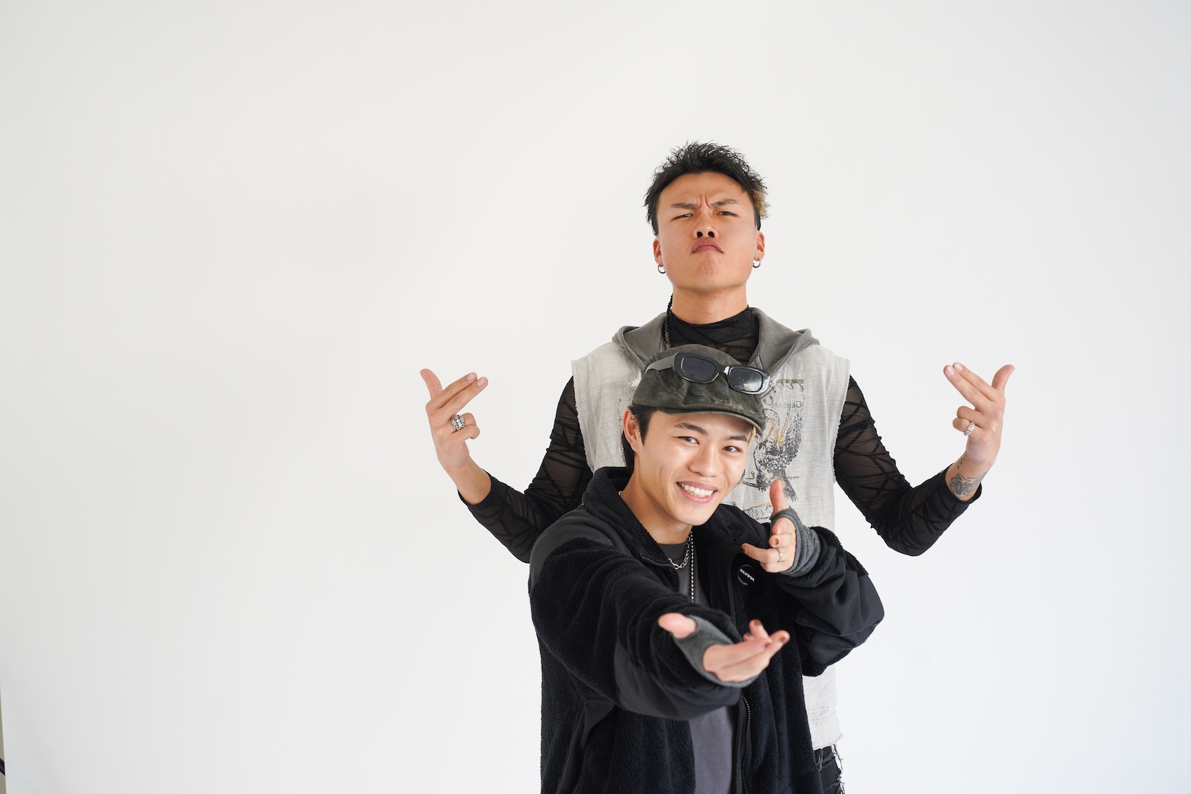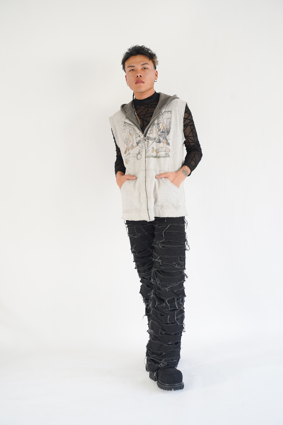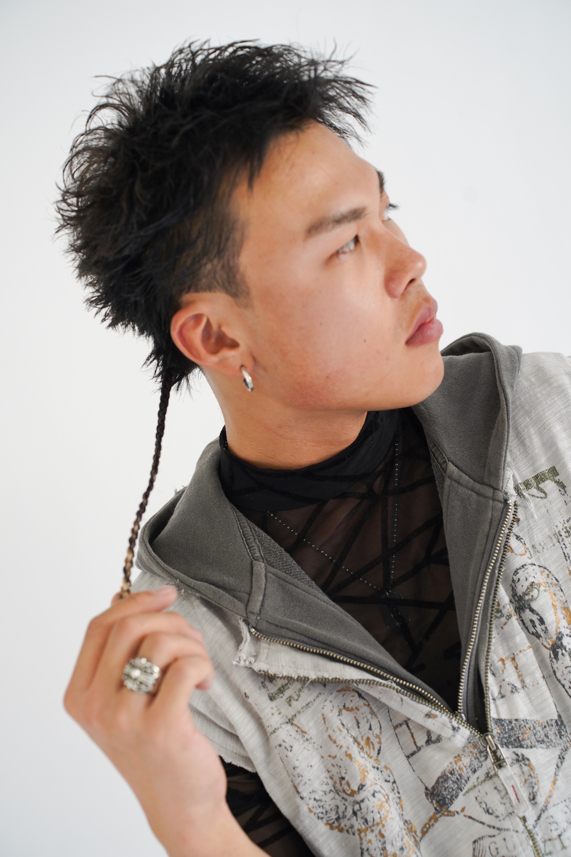 「特殊へアやアヴァンギャルドな要素は、どうしても『作品向け』『非日常的』になりがちですが、今回はそれらを日常のストリートスタイルに落とし込みたいと考えました。強さや個性を持ちながらも、実際に街に存在できるリアリティを持たせることで、ヘアとファッションの新しいバランスを表現しました」という、理想的な進展を狙ったスタイル。「サイドのみ刈り上げたモヒカンショートに、ラフなテクスチャーを重ねることで無骨さと抜け感を両立させました。ポイントでブリーチと編み込み (ブレイズ)を取り入れ、特殊ヘアのパーツをアクセサリー感覚で配置しています。主張しすぎず、スタイル全体の中で自然に存在するヘアデザインを意識しました」。ヘアとファッションが主張し合うのではなく、互いを補完し合う関係性を目指したのも好印象。
