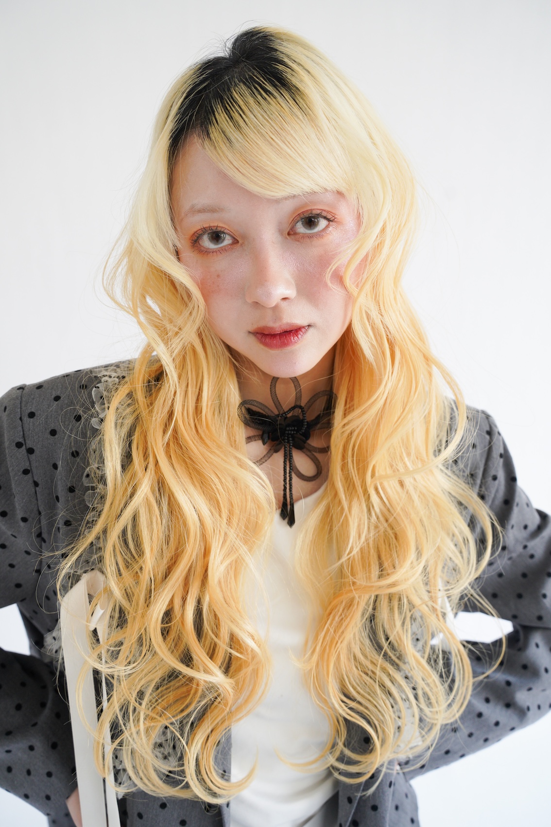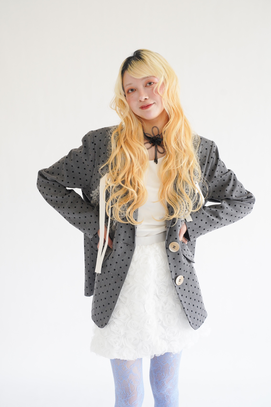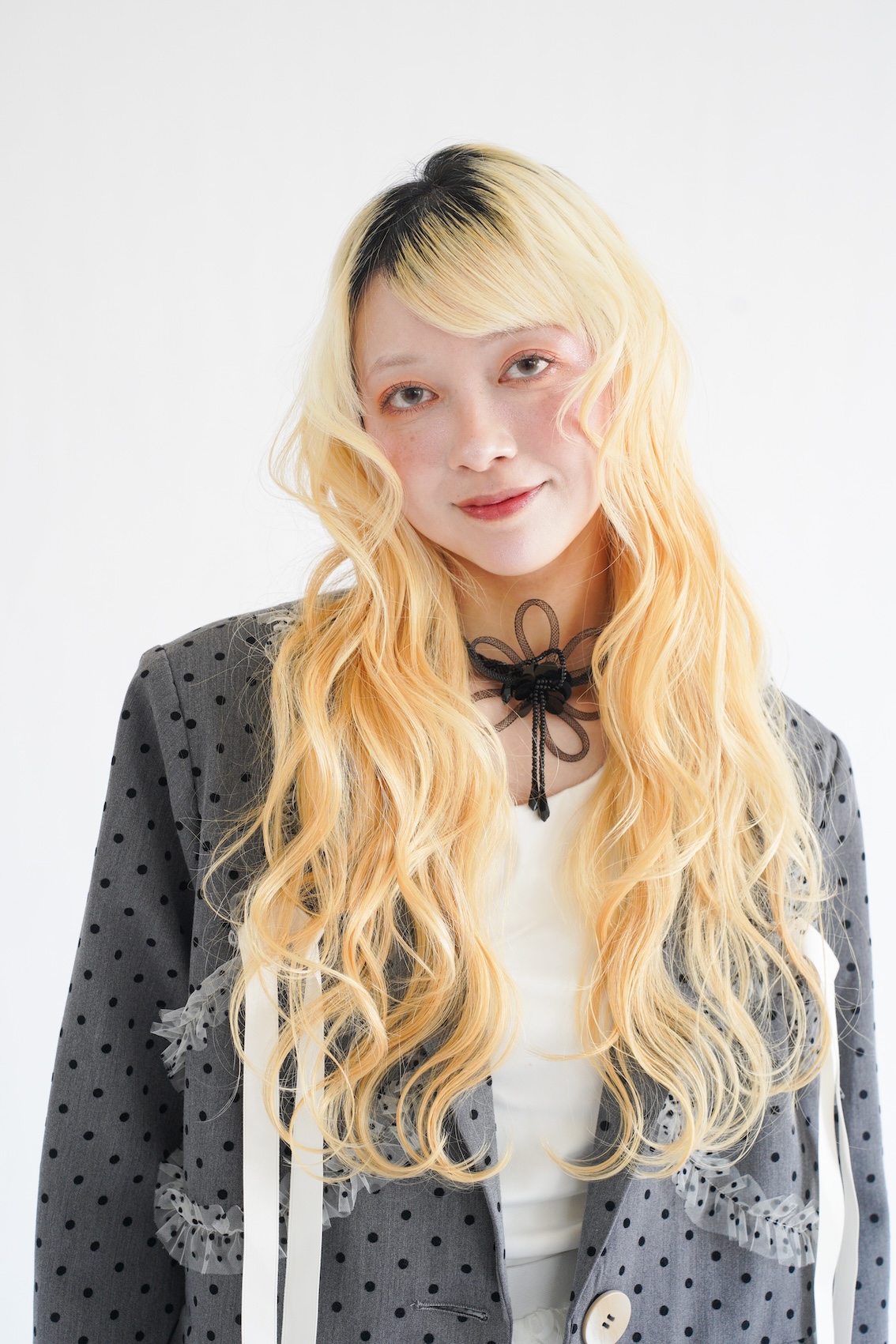 エクレクティックとは様々な分野から良いものを選りすぐり組み合わせるという意味。「2026年の流行のドットやレース、韓国で流行のウィッシュコア、日本で流行のルーズソックス等色々な国で流行っているものをmix+自分の好きを詰め込んだ作品を作ってみたいと思いました」。意気込みあふれるヘアスタイルのこだわりは「モデルさんが細毛でボリュームが出にくい髪質だったので、ボリュームが出るよう意識してパーマをかけたことです。海外girlをイメージしながら巻いてみました☆」そのヘアとファッションのマッチングについては「ブロンドヘアを目立たせたかったので、ファッションはグレー、白、シルバーの3色で全体的に柔らかい雰囲気で統一させています」。シンプルな色の中に2026年のトレンドであるレースやドットを取り入れたり、足元は青紫のタイツであえて外しを入れている。「周りとは少し違う一癖あるファッションにしました☆」